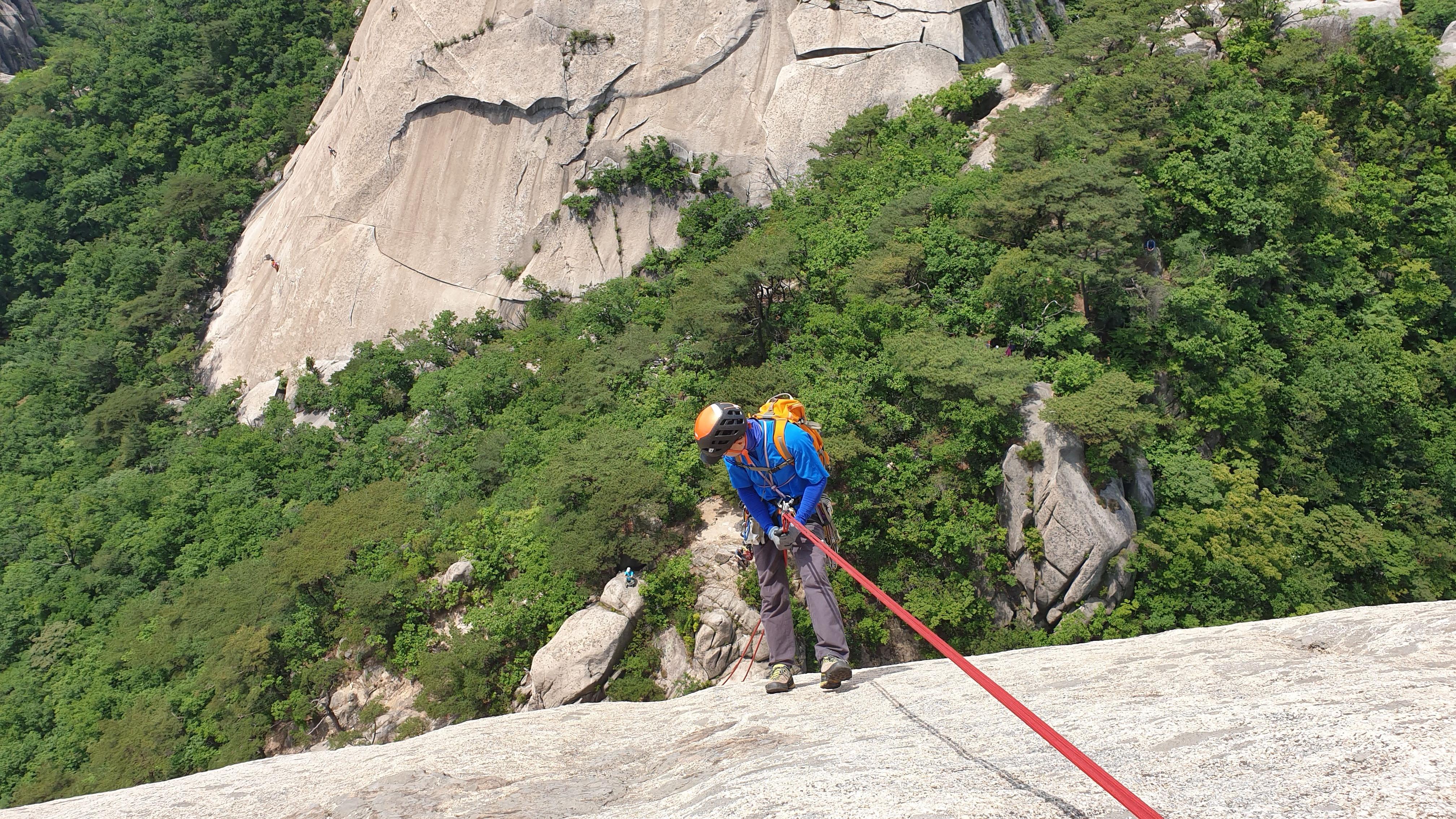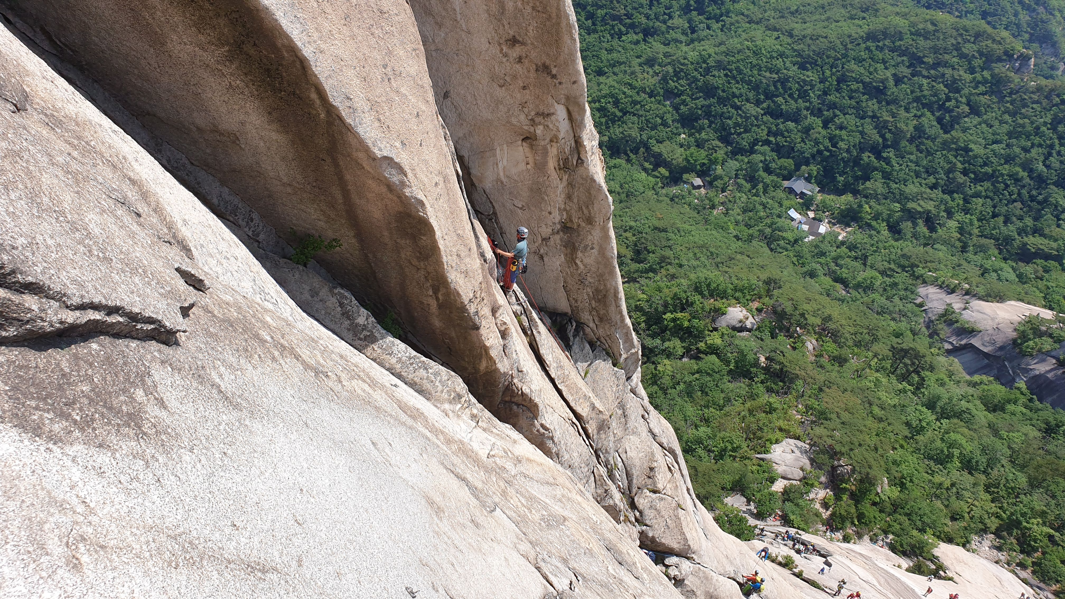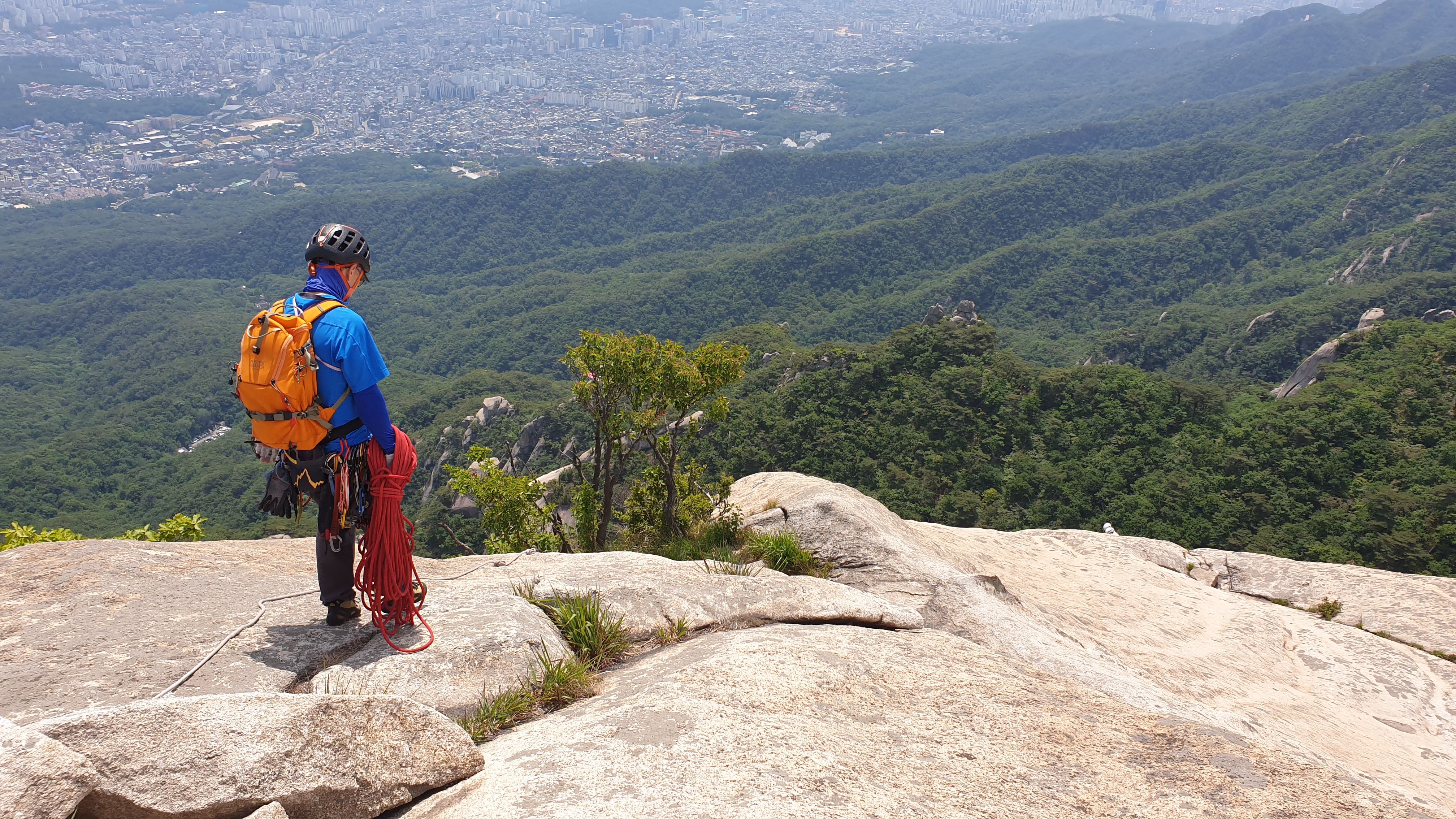 한낮의 또약볕을 피하면서 부담없이 쉽게 오를 수 있는 고독길 등반을 염두에 두고 인수봉 동벽 맨 우측의 출발점에 도착한 시간은 아침 8시 반 경이었다. 비교적 이른 시간이라고 생각했으나 벌써부터 고독길은 만원 상태였다. 휴일의 인수봉은 언제나처럼 만원사례를 이루고 있었다. 취나드B길 출발점에도 모 등산학교 학생들이 단체로 기다리고 있는 상태였으나 앞 팀과의 사이가 잠깐 빈 틈을 타서 오아시스까지 올랐다. 취나드B길로 갈까 생각했으나 역시나 여러 명이 우리 앞에 등반 중이었다. 인수A길은 비어 있는 듯하여 변형 루트로 정상까지 재빠르게 올랐다. 인수봉 정상도 모 산악회의 회갑기념 등반 모임 장소로 점령되어 있었다. 플래카드가 정상 바위를 휘감고 있었고 회원들은 자리를 뜰 생각이 없어 보였다. 우리팀이 조용히 쉴 틈은 없어서 일찍 하강하기로 했다. 마음의 여유가 없는 휴일의 인수봉 등반은 아무래도 내 스타일은 아닌 듯하다.