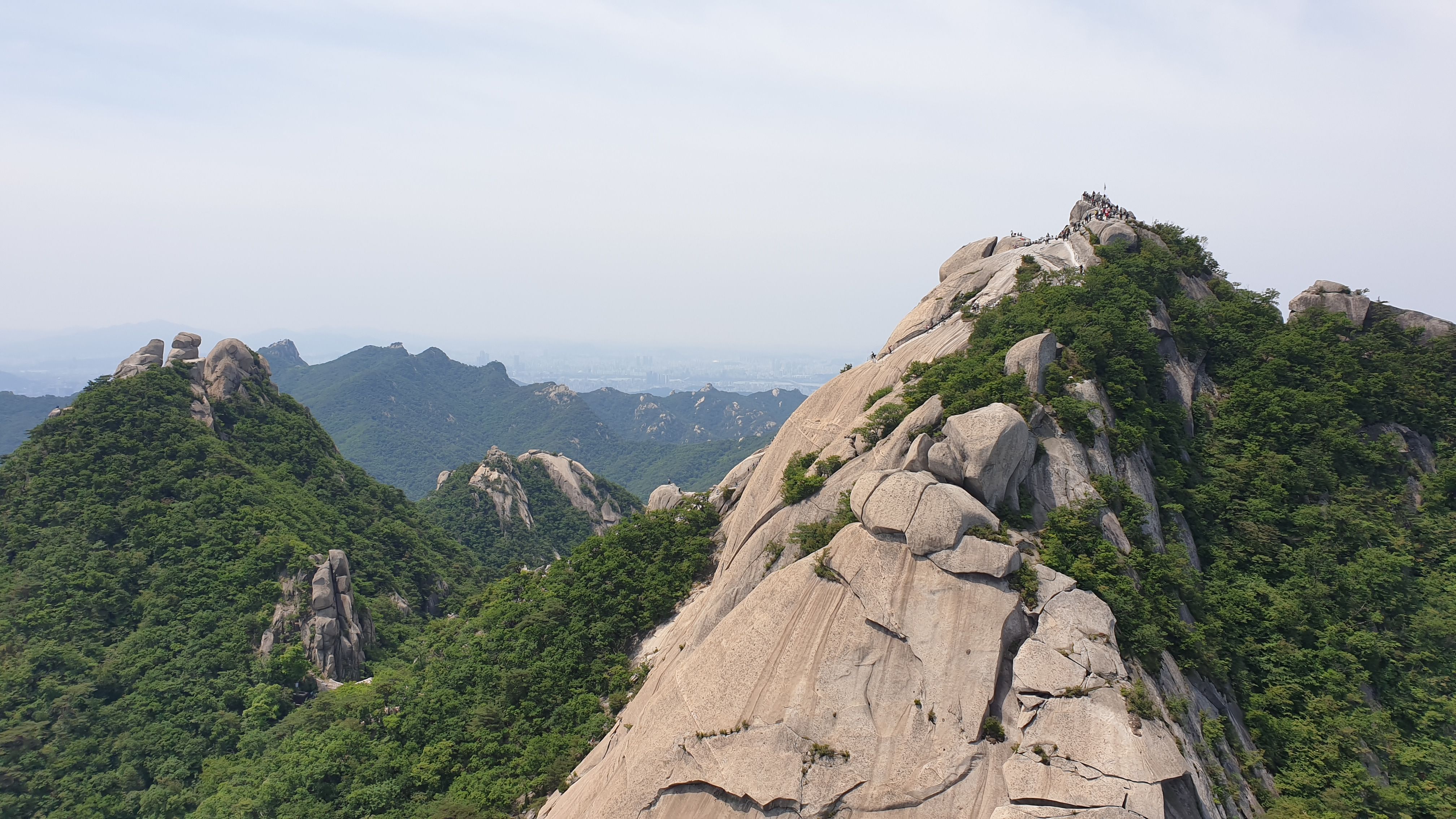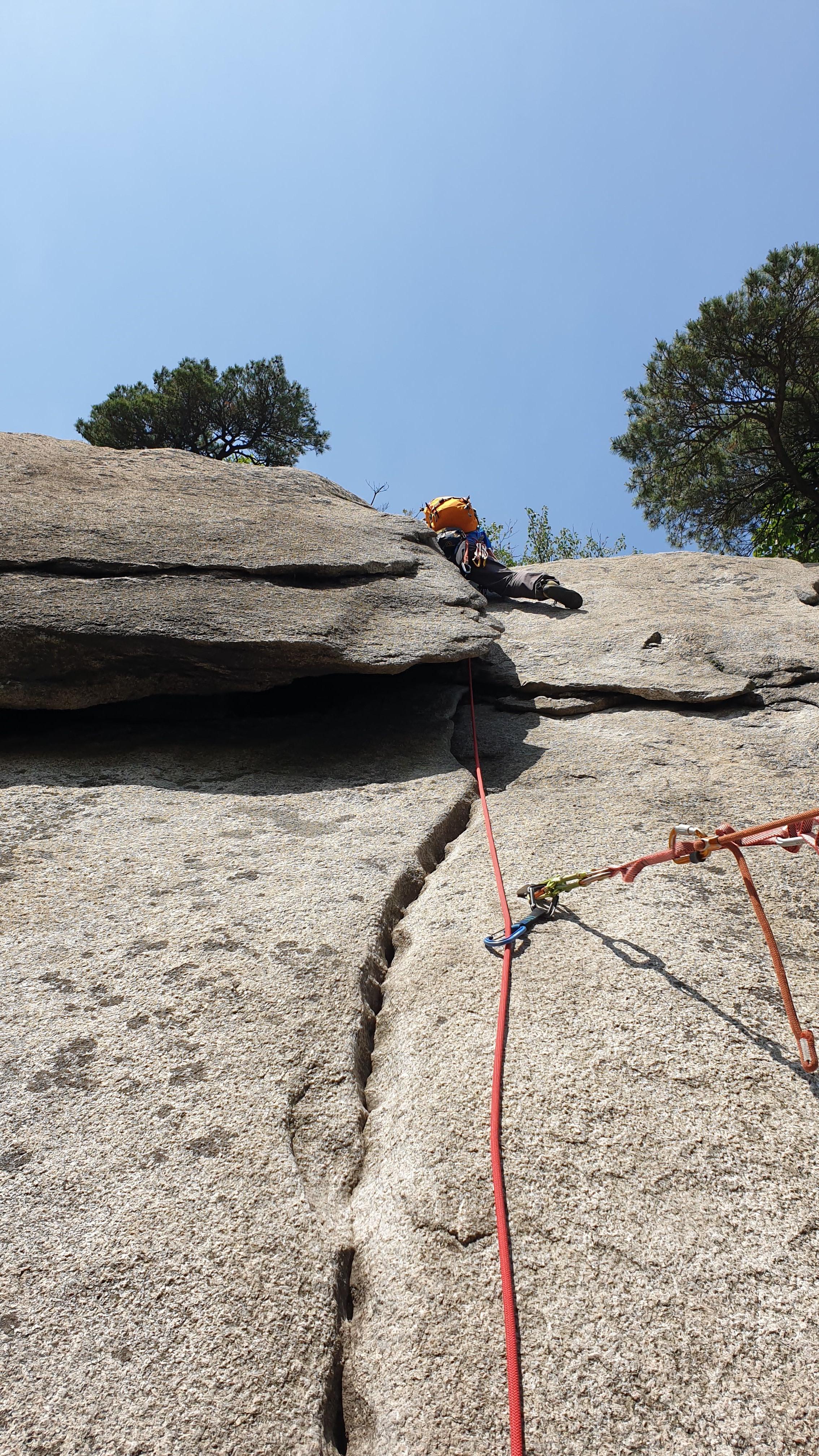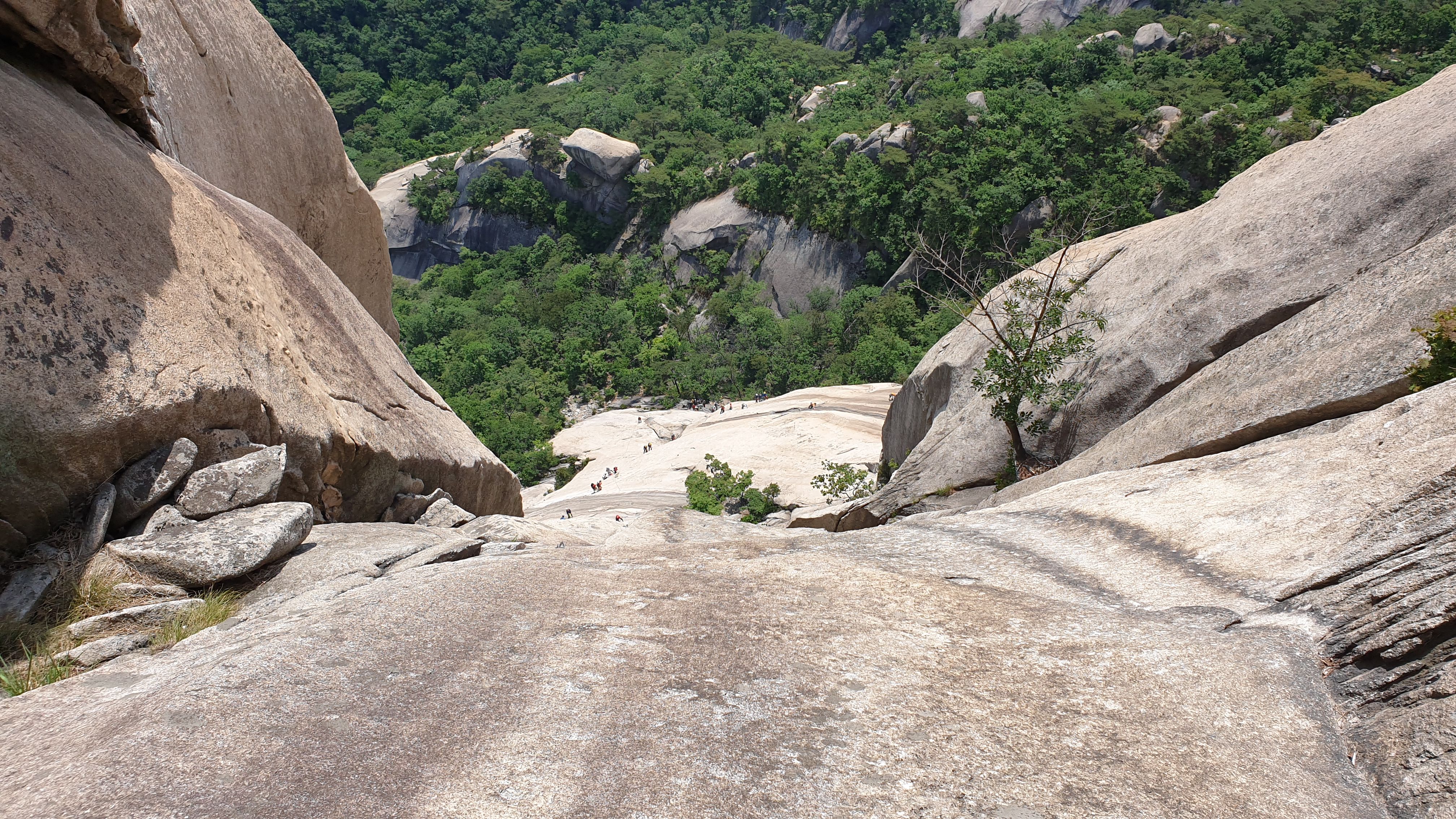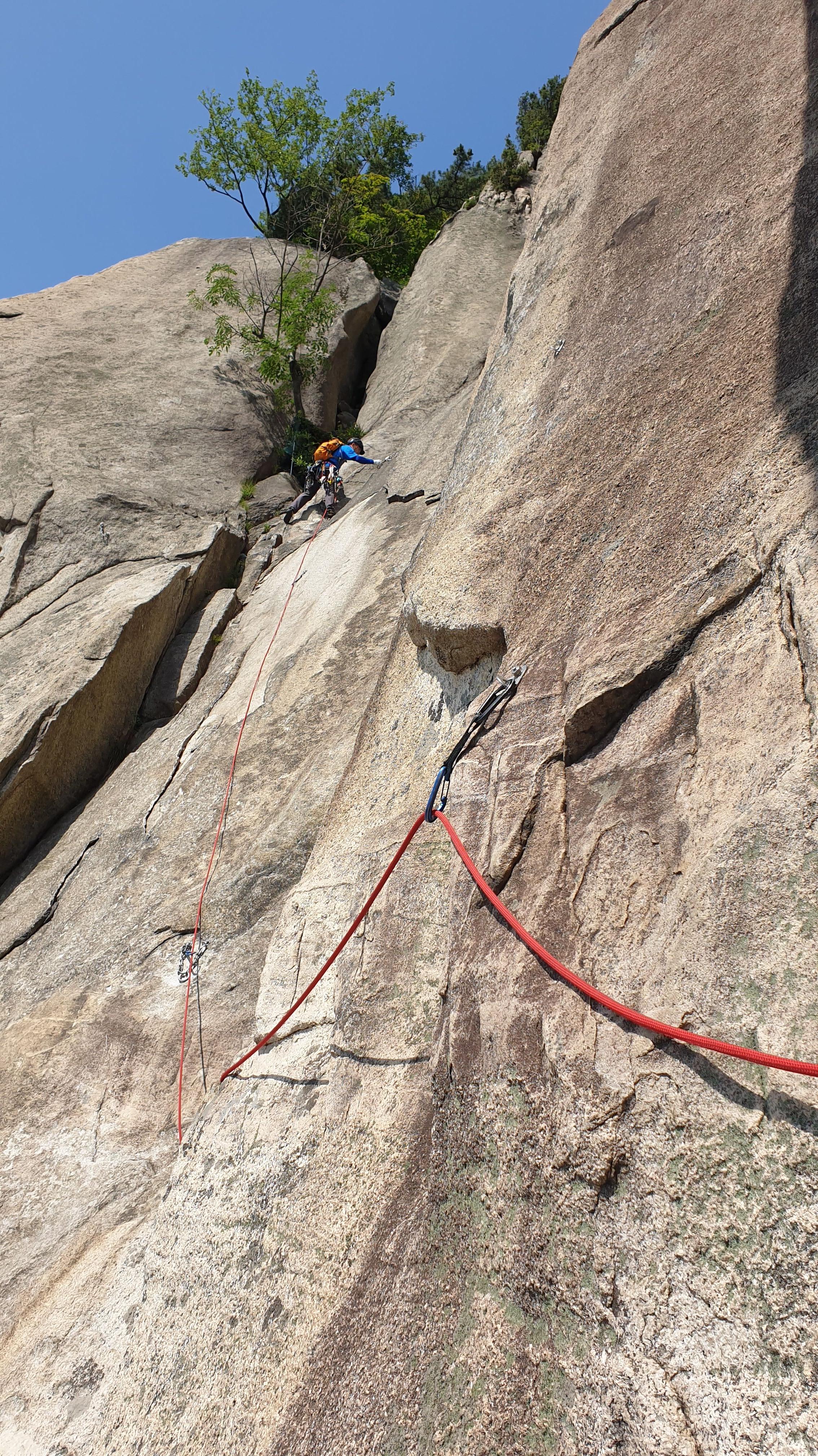 한낮의 또약볕을 피하면서 부담없이 쉽게 오를 수 있는 고독길 등반을 염두에 두고 인수봉 동벽 맨 우측의 출발점에 도착한 시간은 아침 8시 반 경이었다. 비교적 이른 시간이라고 생각했으나 벌써부터 고독길은 만원 상태였다. 휴일의 인수봉은 언제나처럼 만원사례를 이루고 있었다. 취나드B길 출발점에도 모 등산학교 학생들이 단체로 기다리고 있는 상태였으나 앞 팀과의 사이가 잠깐 빈 틈을 타서 오아시스까지 올랐다. 취나드B길로 갈까 생각했으나 역시나 여러 명이 우리 앞에 등반 중이었다. 인수A길은 비어 있는 듯하여 변형 루트로 정상까지 재빠르게 올랐다. 인수봉 정상도 모 산악회의 회갑기념 등반 모임 장소로 점령되어 있었다. 플래카드가 정상 바위를 휘감고 있었고 회원들은 자리를 뜰 생각이 없어 보였다. 우리팀이 조용히 쉴 틈은 없어서 일찍 하강하기로 했다. 마음의 여유가 없는 휴일의 인수봉 등반은 아무래도 내 스타일은 아닌 듯하다.