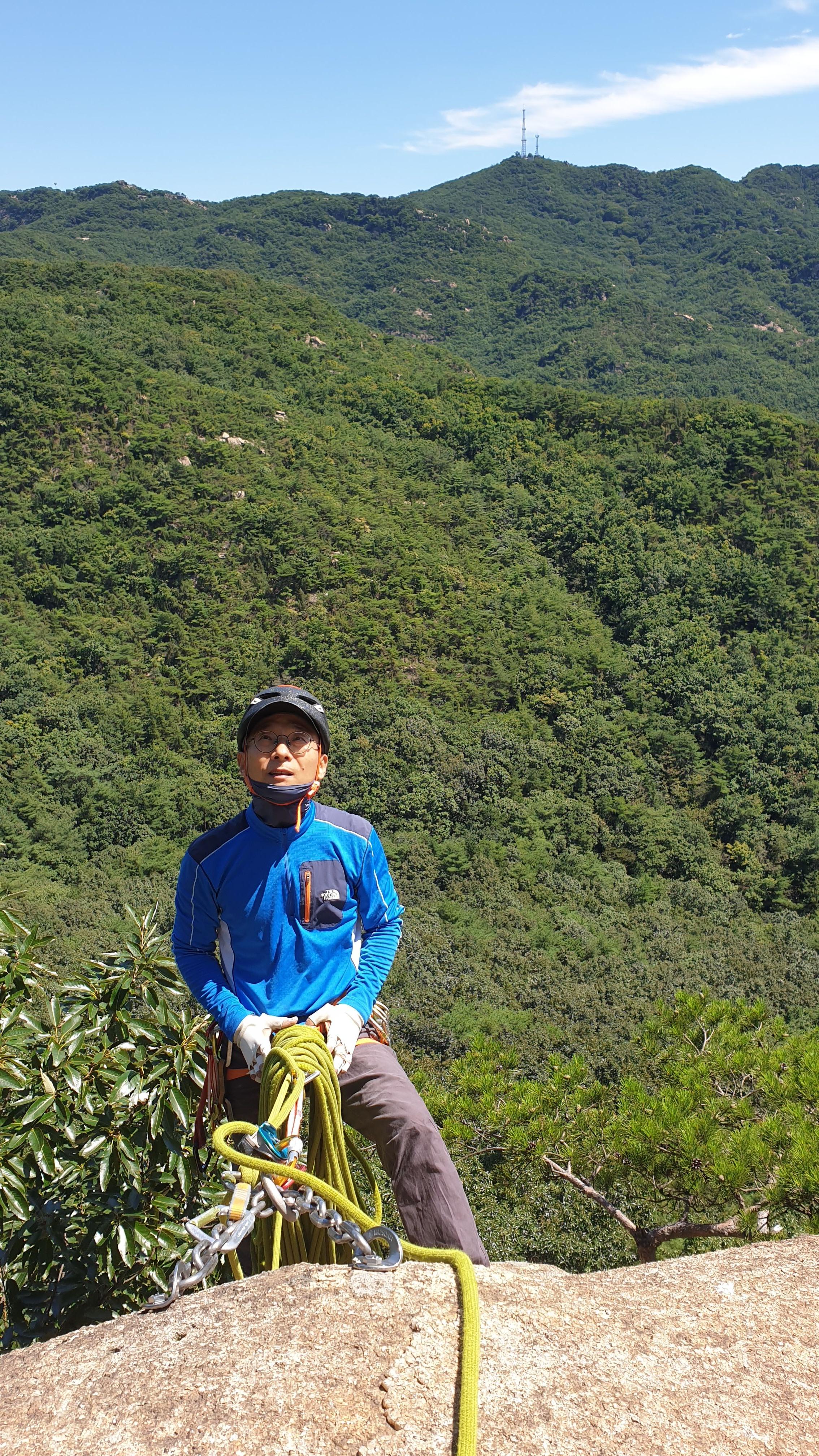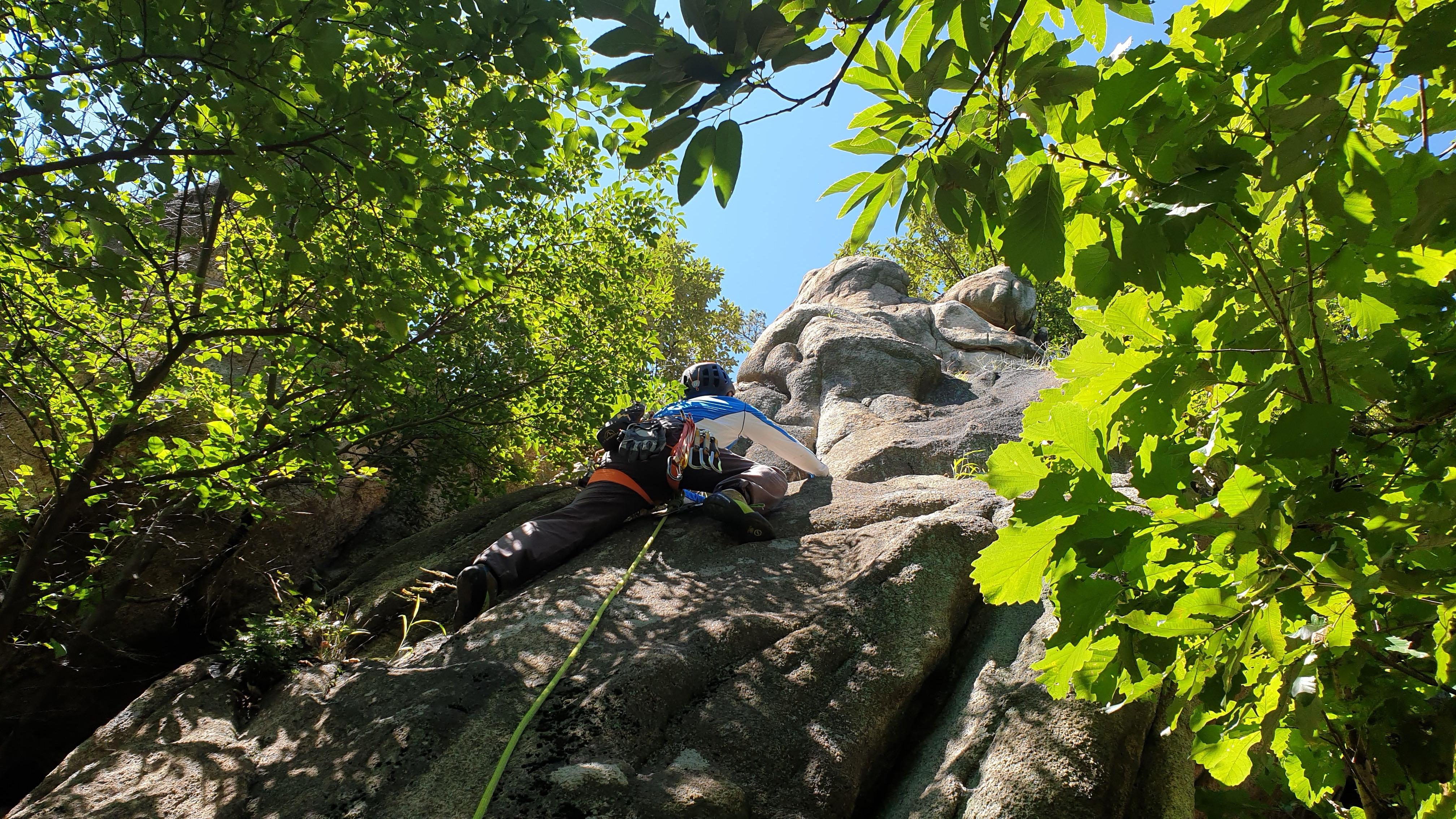 초가을의 쾌청한 날씨 속에 기대했던 것과는 달리 많은 클라이머들로 아담한 숨은암장이 시끌벅적 했다. 자일을 걸어 놓고 톱로핑으로 등반하는 사람들에게 아래에서 훈수를 두는 요란한 소리가 끊이질 않았다. 다닥다닥 붙어 있는 루트들을 하나 하나 등반한다는 게 사실상 불가능한 상황이었다. 어차피 등반 열정이 불타오르는 몸상태는 아니어서 중앙벽 좌우에 있는 멀티피치 루트를 오르는 것으로 위안을 삼았다. 암장 위로 이어진 피치들에는 우리팀 외에 등반하는 이들이 아무도 없어서 비로소 조용하고 평화로운 자연 속에 안겼다는 해방감이 찾아왔다. 숨은암장의 유명한 루트들보다는 오전과 오후에 등반한 4 피치의 바윗길 두 개에서 뜻밖의 기분전환을 만끽했던 하루였다.