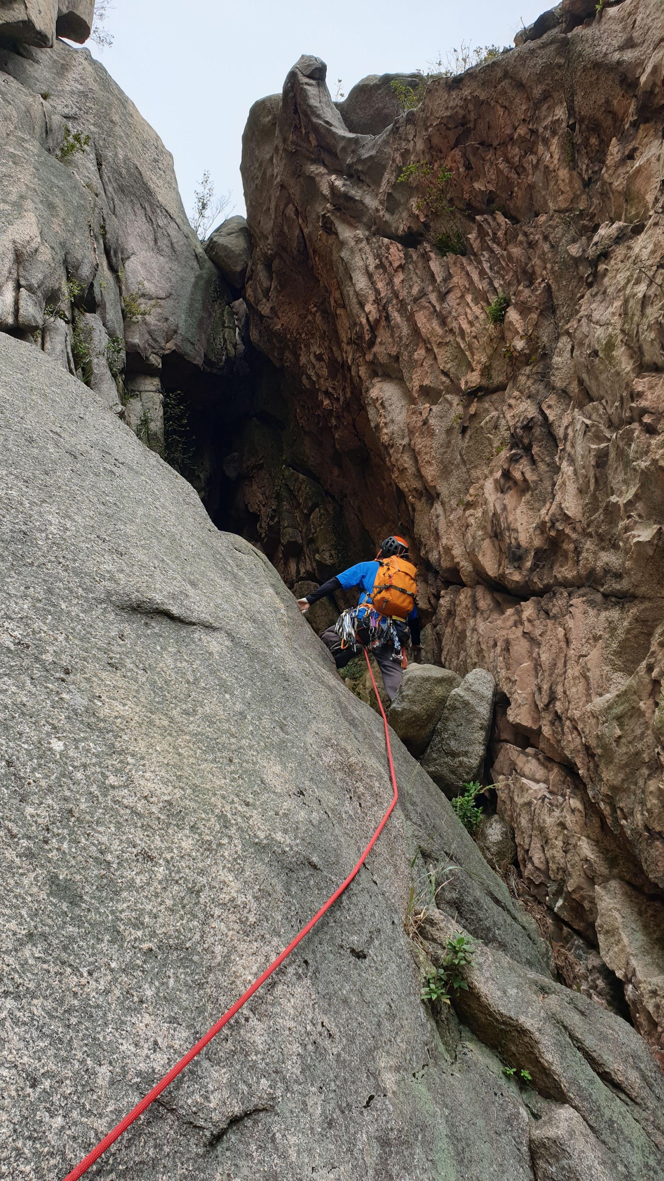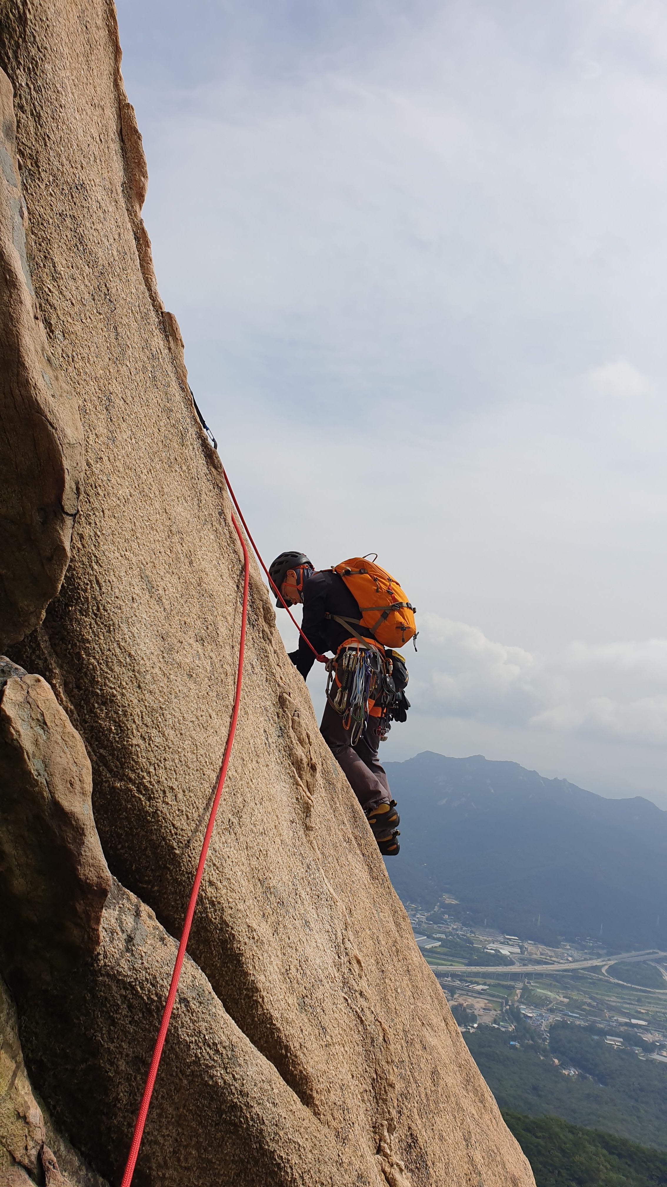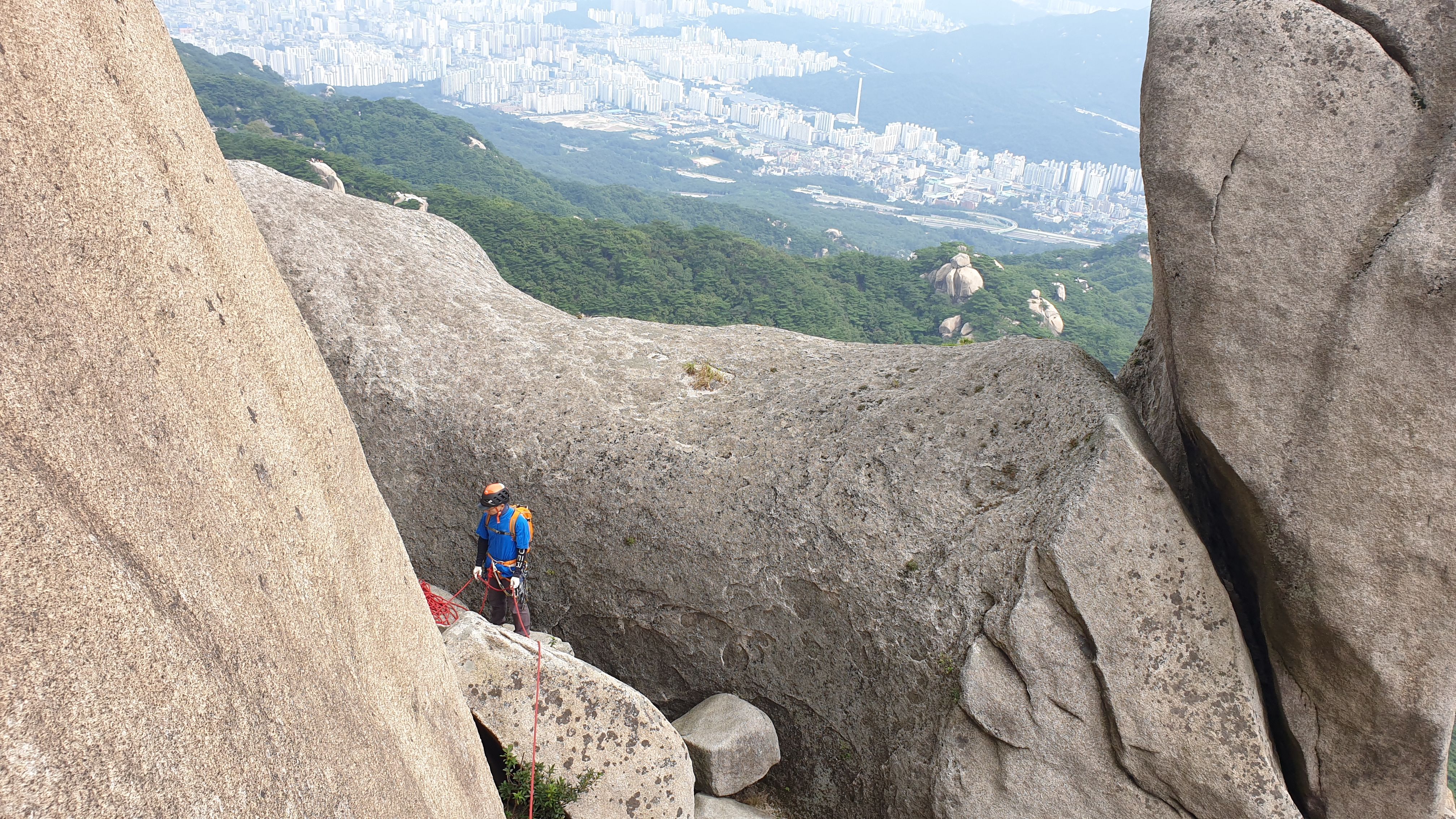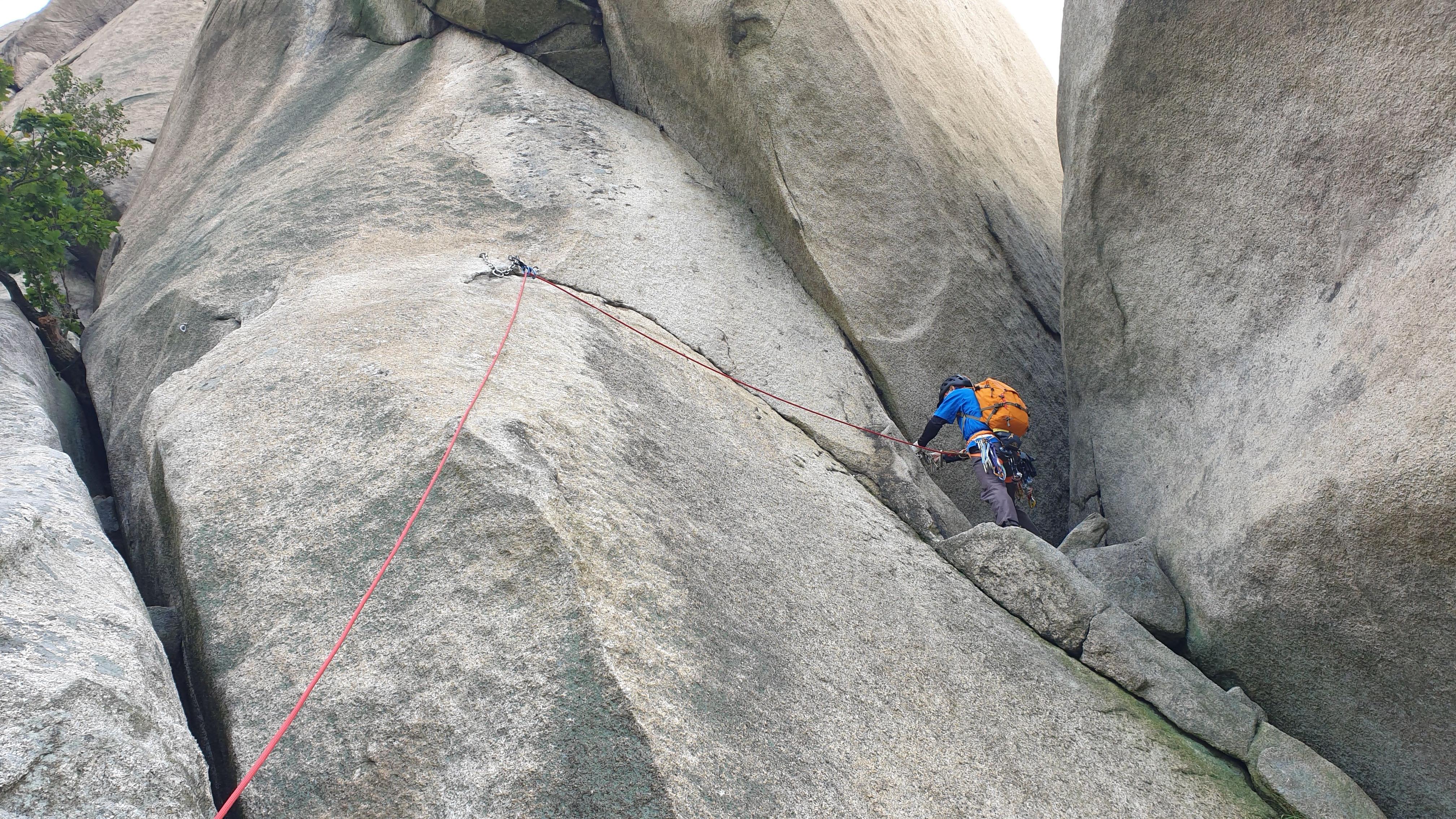 추석 연휴의 마지막 날이다. 오랜만에 도봉산의 선인봉으로 향한다. 나주의 고향집을 다녀오는 길에 장시간의 운전으로 피곤이 쌓인 심신을 달래기 위해 부담 없이 다녀올 수 있는 남측길 등반에 나선다. 아침 8시 즈음에 도봉탐방안내소를 통과하여 1시간 30분 정도의 어프로치를 통해 남측길 출발점인 타이타닉 바위 앞의 공터에 도착한다. 사방으로 확 트인 멋진 조망을 즐기며 여유롭게 장비를 착용한 후 남측길 등반을 출발한다. 작년에 처음으로 등반했던 경험을 되살려 펜듈럼 구간과 침니를 가뿐하게 통과한다. 호랑이굴을 관통하여 선인봉 정상에 올라 한가로운 점심시간을 즐긴다. 오늘은 만장봉으로 가지 않고 곧바로 하강하여 천천히 산을 내려온다. 아담한 폭포 아래의 계곡물에서 탁족하는 순간 암벽화에 시달렸을 발이 치유되는 듯한 시원함이 느껴진다. 초가을의 청명한 하늘 아래에서 상쾌한 기분으로 편안하게 등반을 즐겼다는 만족감이 남았다.