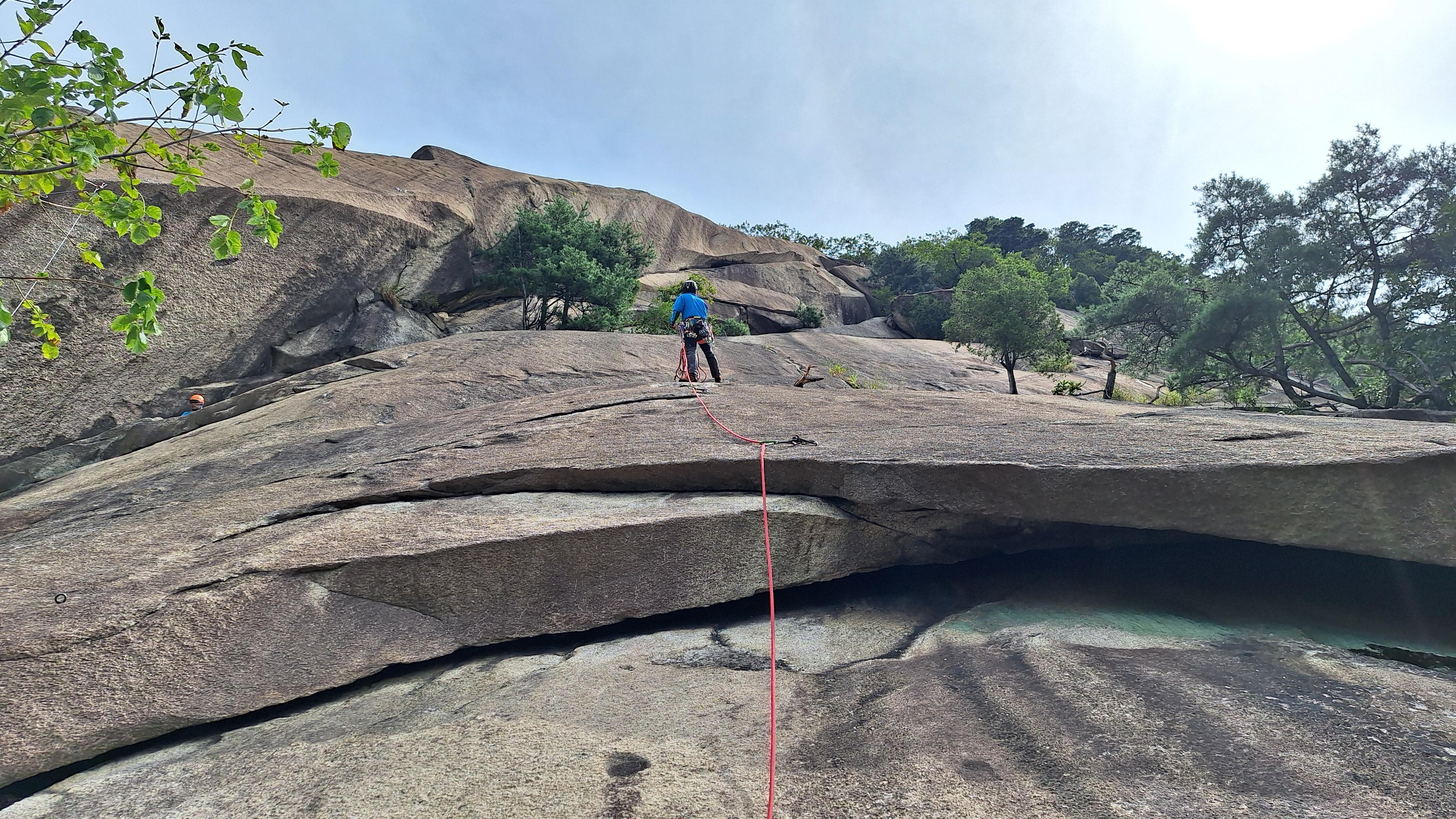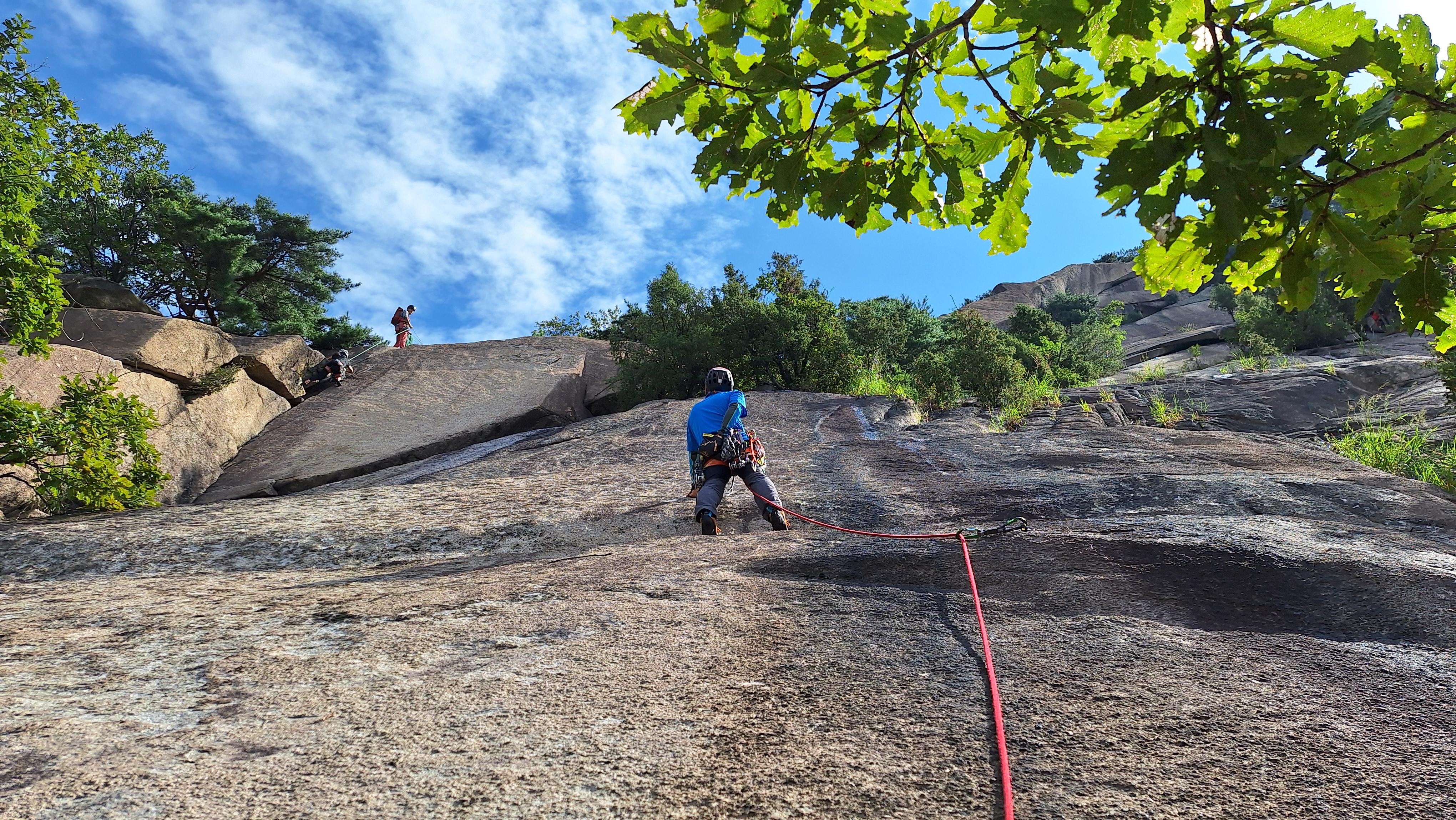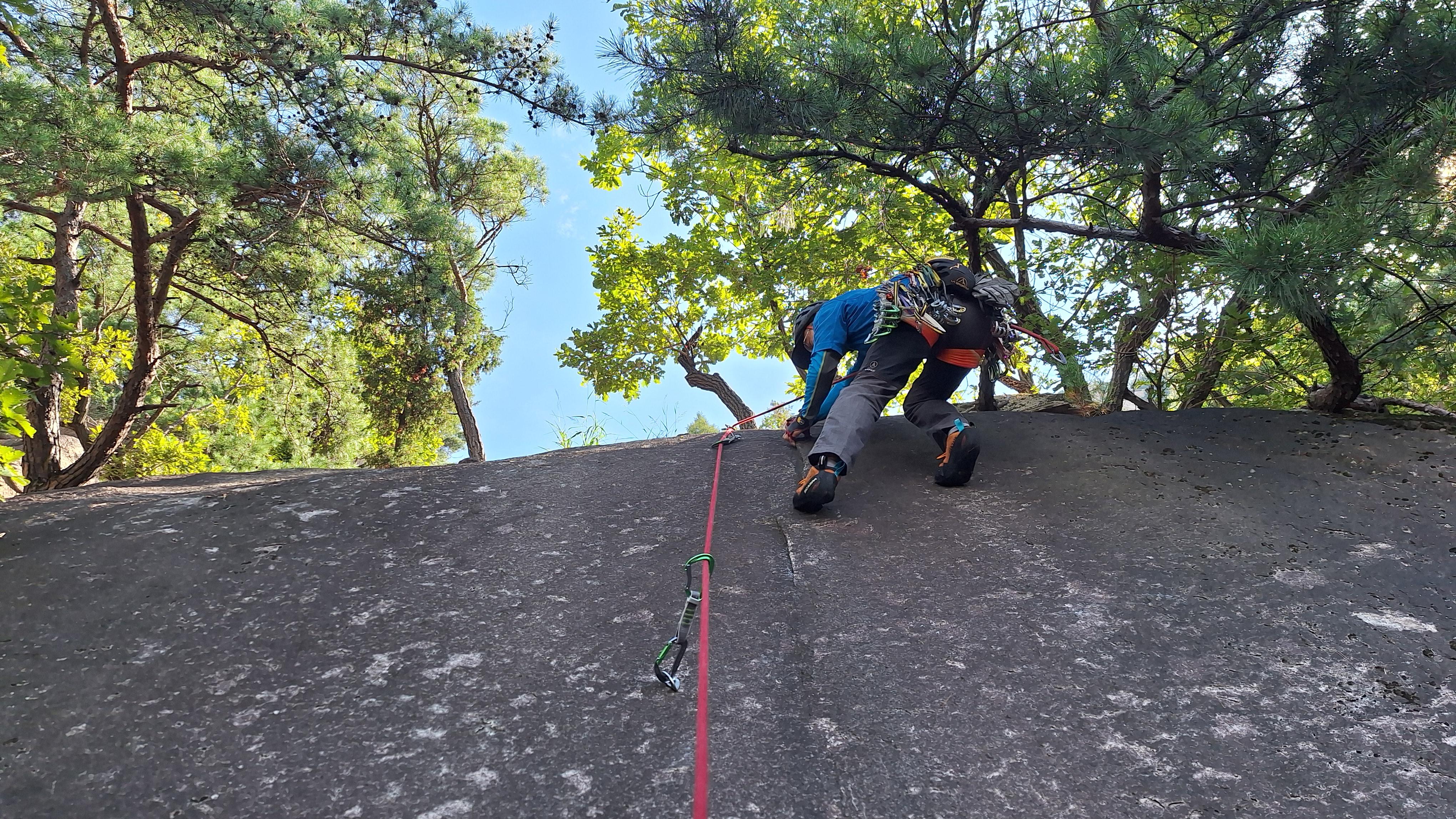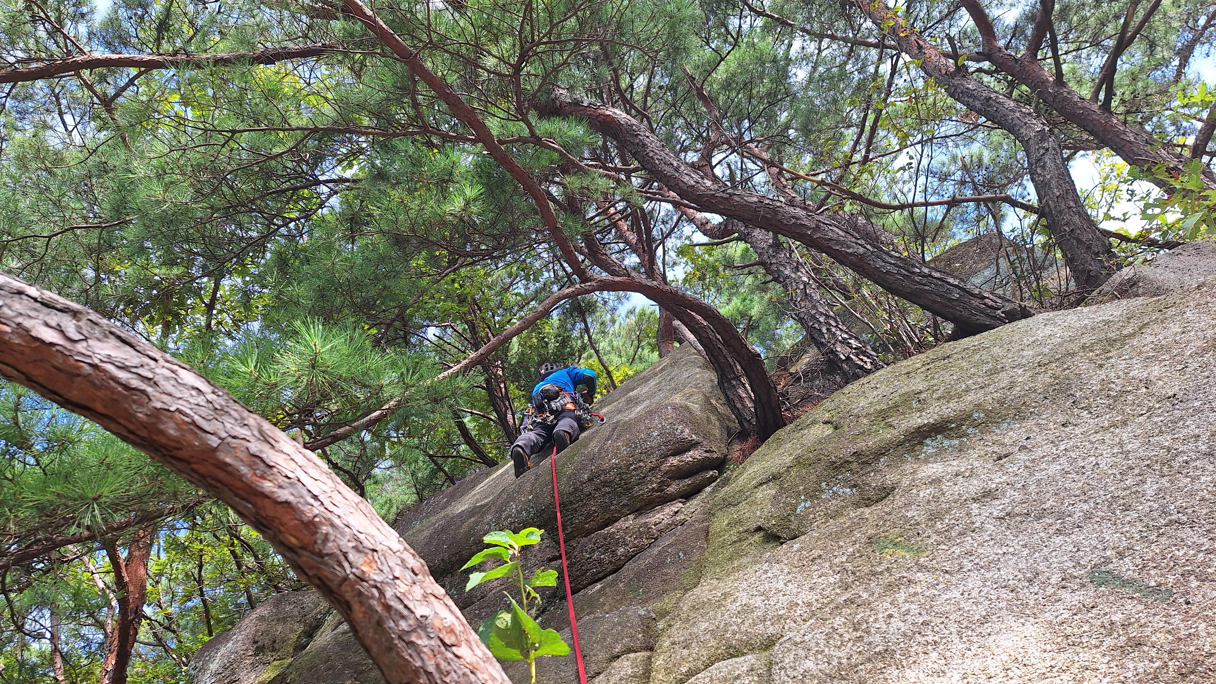 오늘 등반은 추석연휴에 떠나기로 한 중국 칭다오 등반여행을 염두에 둔 훈련을 생각하면서 멀티피치 등반시스템과 장비를 점검하는 기회로 삼기로 한다. 활바위암장에 개척되어 있는 여섯 개의 멀티피치 루트 중에서 등반 팀이 붙어 있지 않은 '아우디 선물릿지(일명 선물길)'를 먼저 올랐다. 대부분 슬랩으로 구성된 여섯 피치를 등반한 후, 활바위 정상으로 향하는 날등을 인공등반 방식으로 올라야 하는 마지막 피치는 생략하고 하강하여 점심을 먹었다. 점심 후에는 크랙이 잘 발달된 코스를 따라서 오르기로 하고, '청출어람' 루트에 붙었다. 손맛 좋은 크랙등반을 즐기면서 4피치까지 등반한 후, 다음 피치를 이어갈 수 없는 상황이었다. 5피치 확보점 주변에서 여러 명이 베이스캠프를 차려놓고 인공등반을 연습 중이었던 것이다.