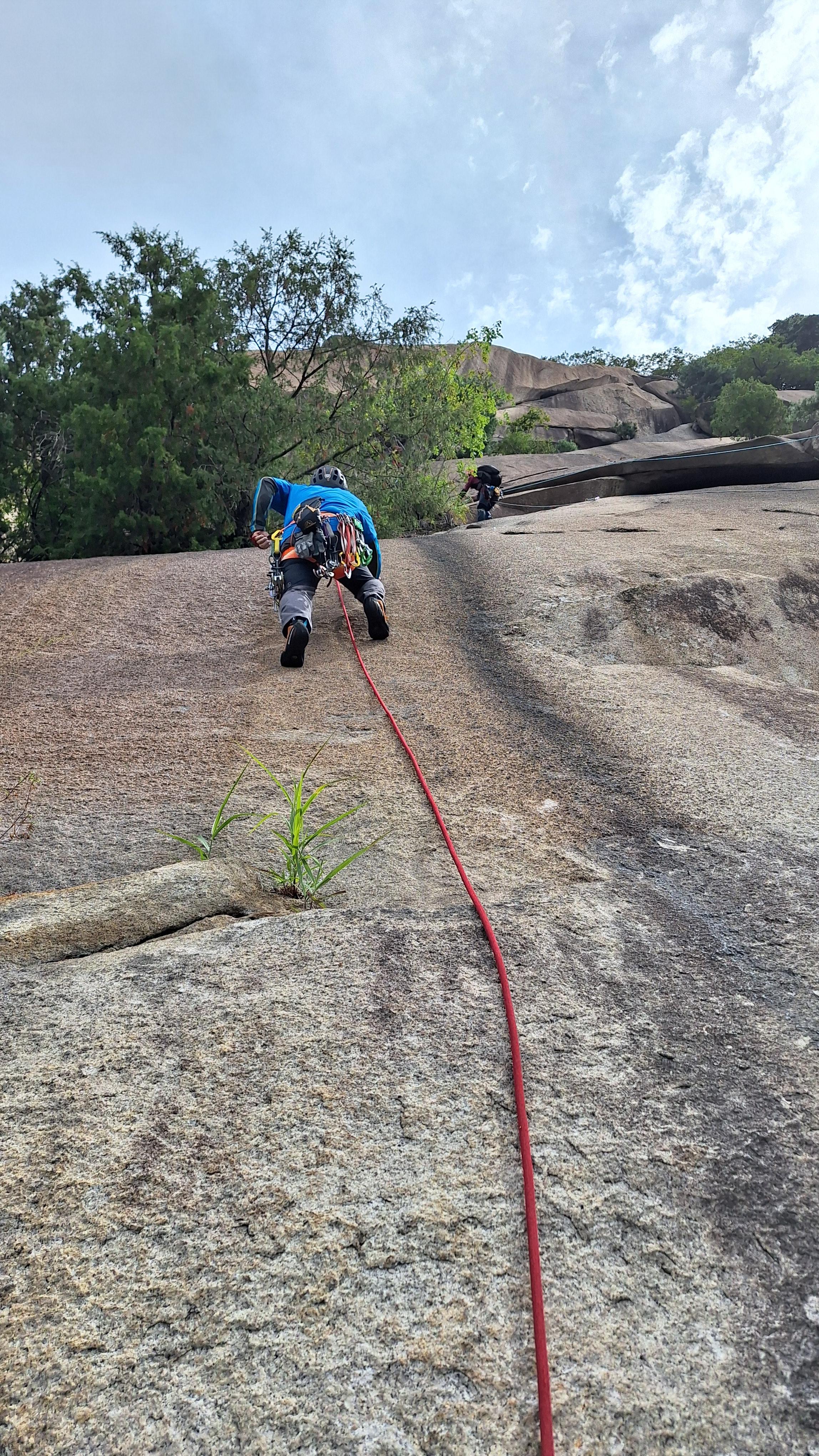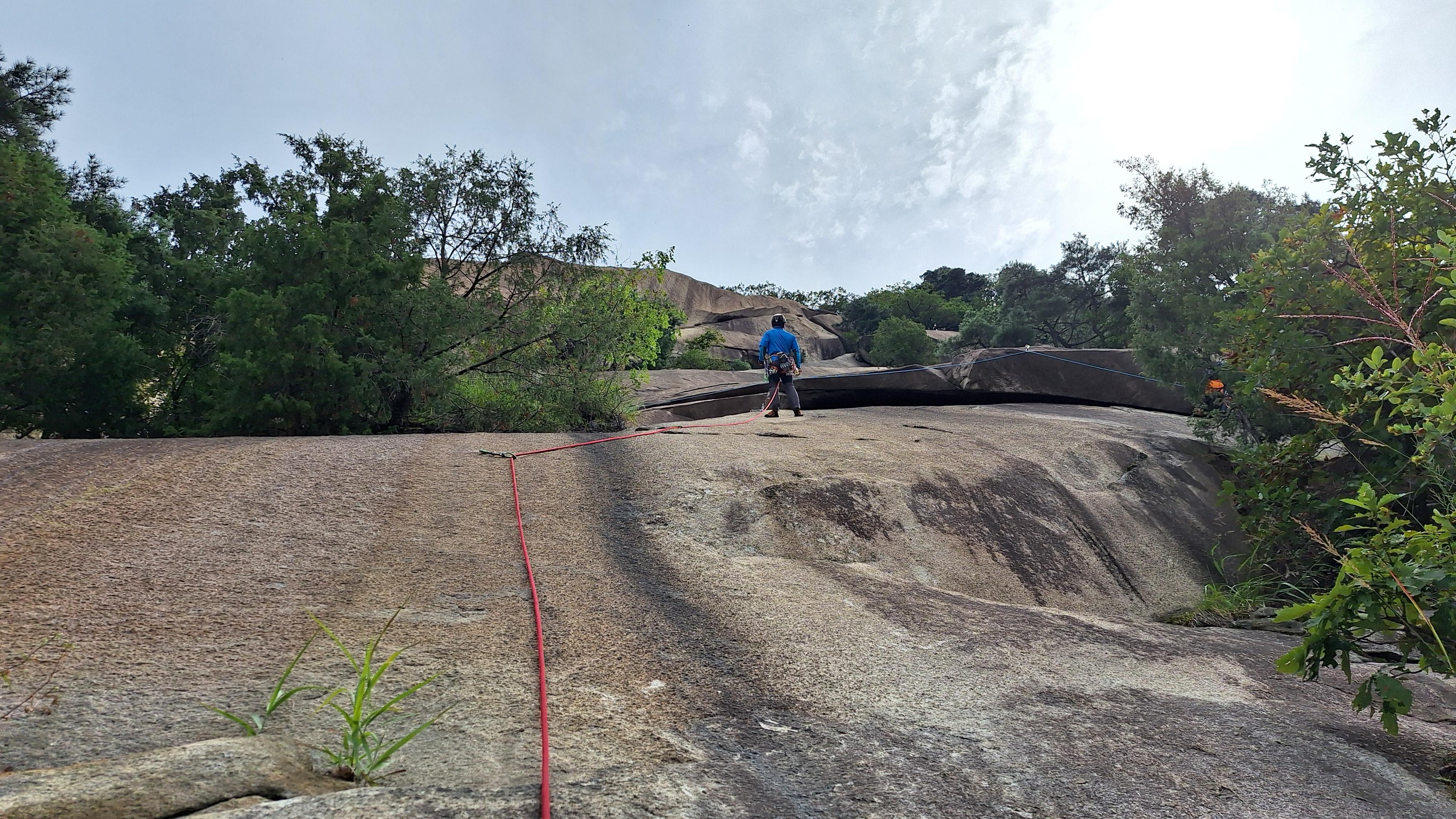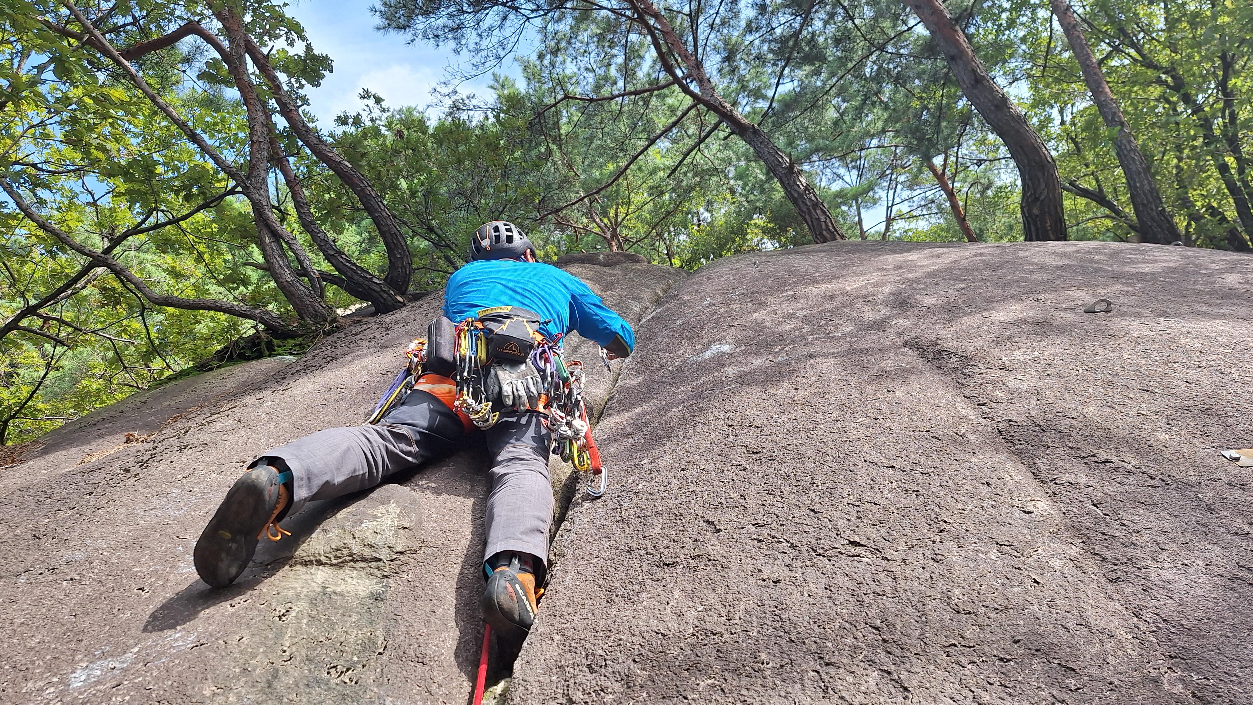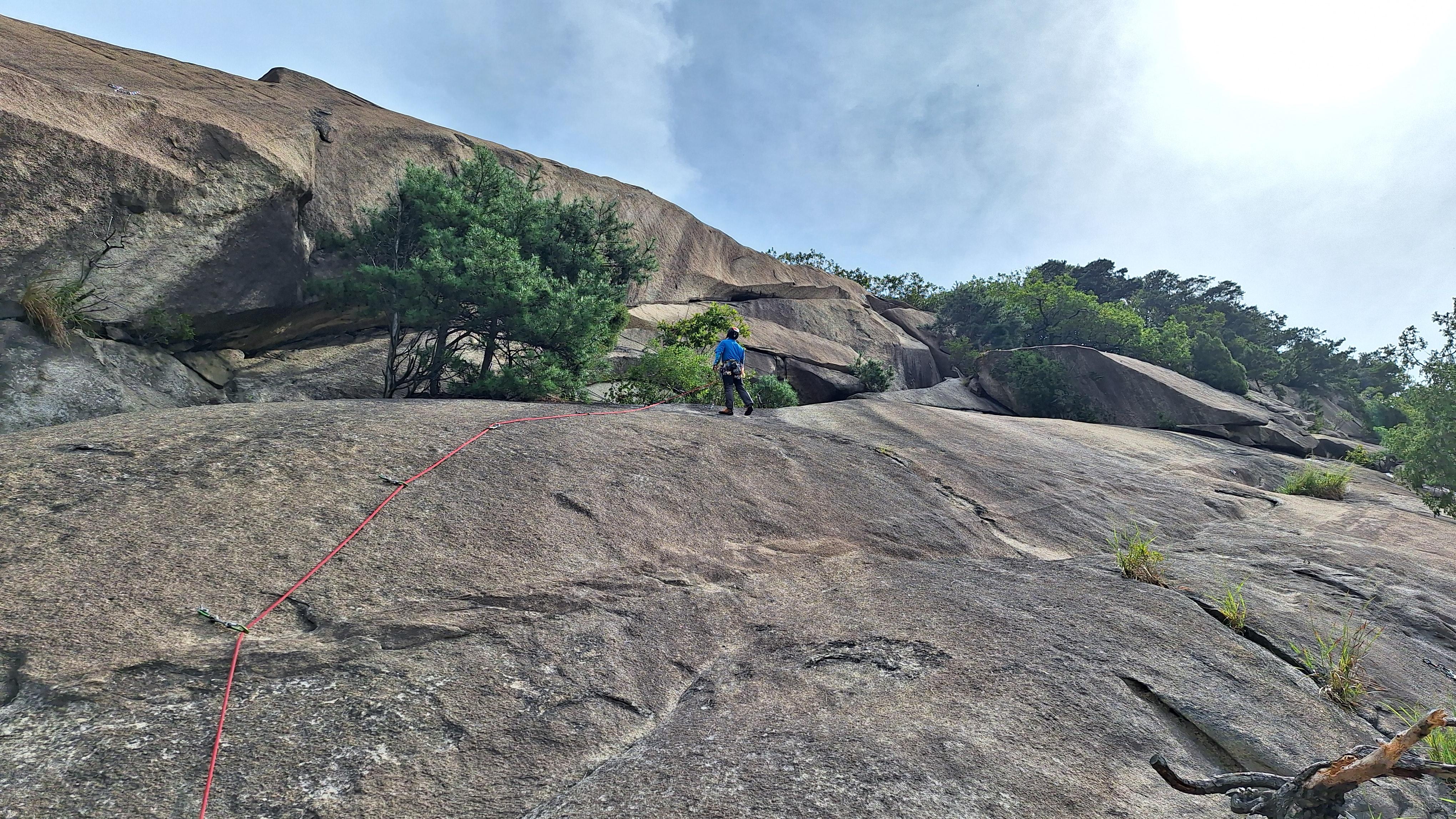 오늘 등반은 추석연휴에 떠나기로 한 중국 칭다오 등반여행을 염두에 둔 훈련을 생각하면서 멀티피치 등반시스템과 장비를 점검하는 기회로 삼기로 한다. 활바위암장에 개척되어 있는 여섯 개의 멀티피치 루트 중에서 등반 팀이 붙어 있지 않은 '아우디 선물릿지(일명 선물길)'를 먼저 올랐다. 대부분 슬랩으로 구성된 여섯 피치를 등반한 후, 활바위 정상으로 향하는 날등을 인공등반 방식으로 올라야 하는 마지막 피치는 생략하고 하강하여 점심을 먹었다. 점심 후에는 크랙이 잘 발달된 코스를 따라서 오르기로 하고, '청출어람' 루트에 붙었다. 손맛 좋은 크랙등반을 즐기면서 4피치까지 등반한 후, 다음 피치를 이어갈 수 없는 상황이었다. 5피치 확보점 주변에서 여러 명이 베이스캠프를 차려놓고 인공등반을 연습 중이었던 것이다.