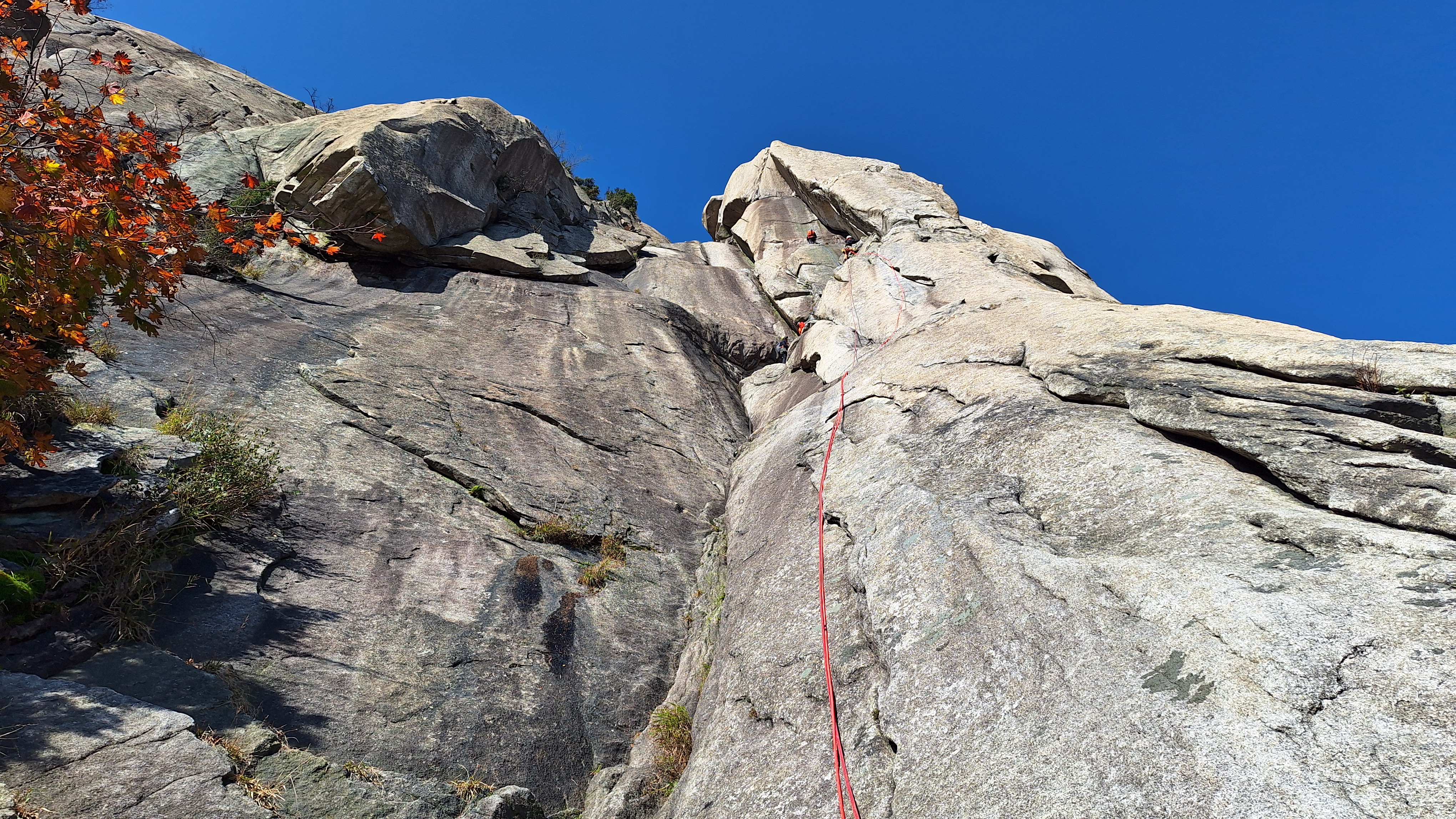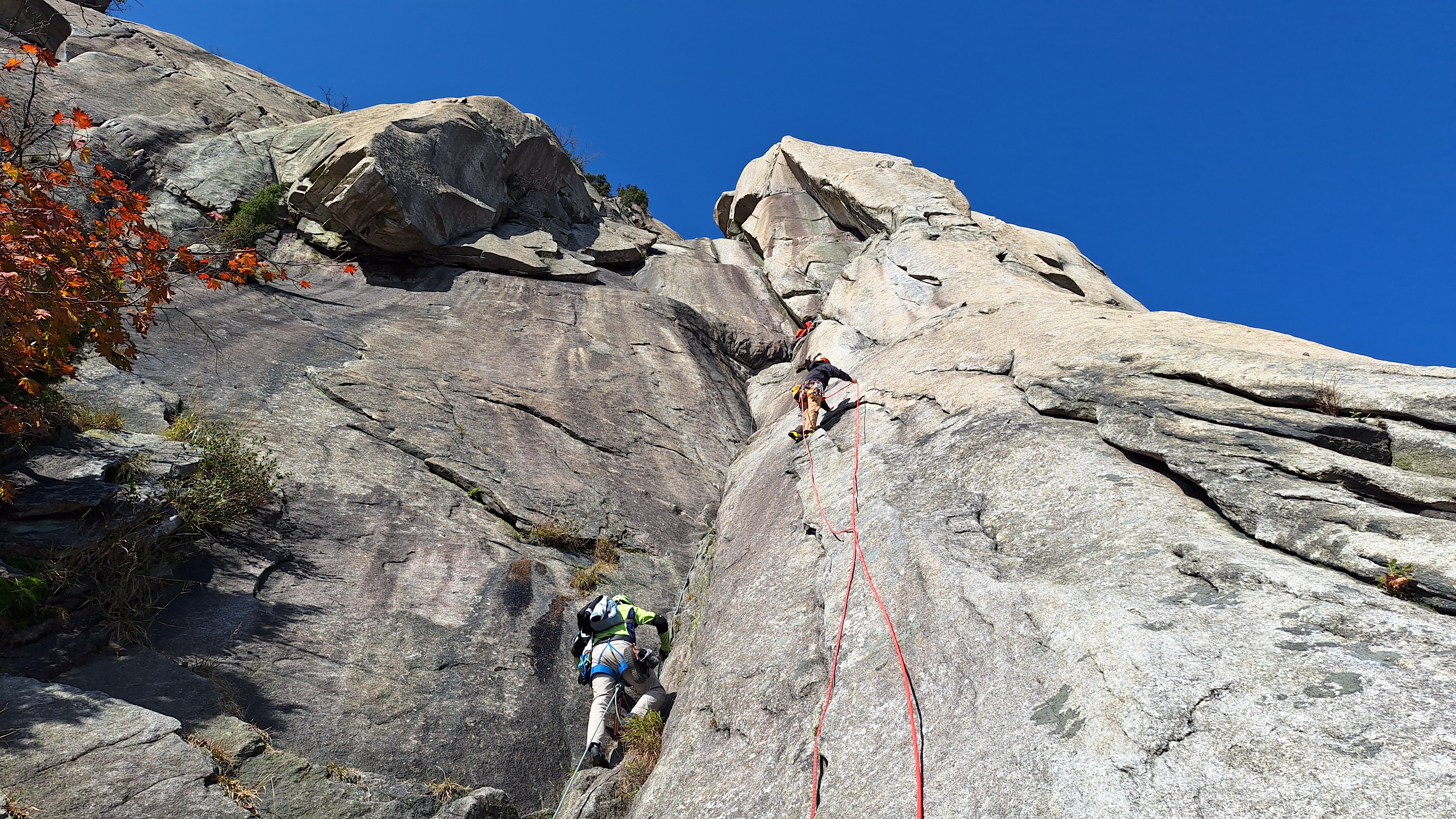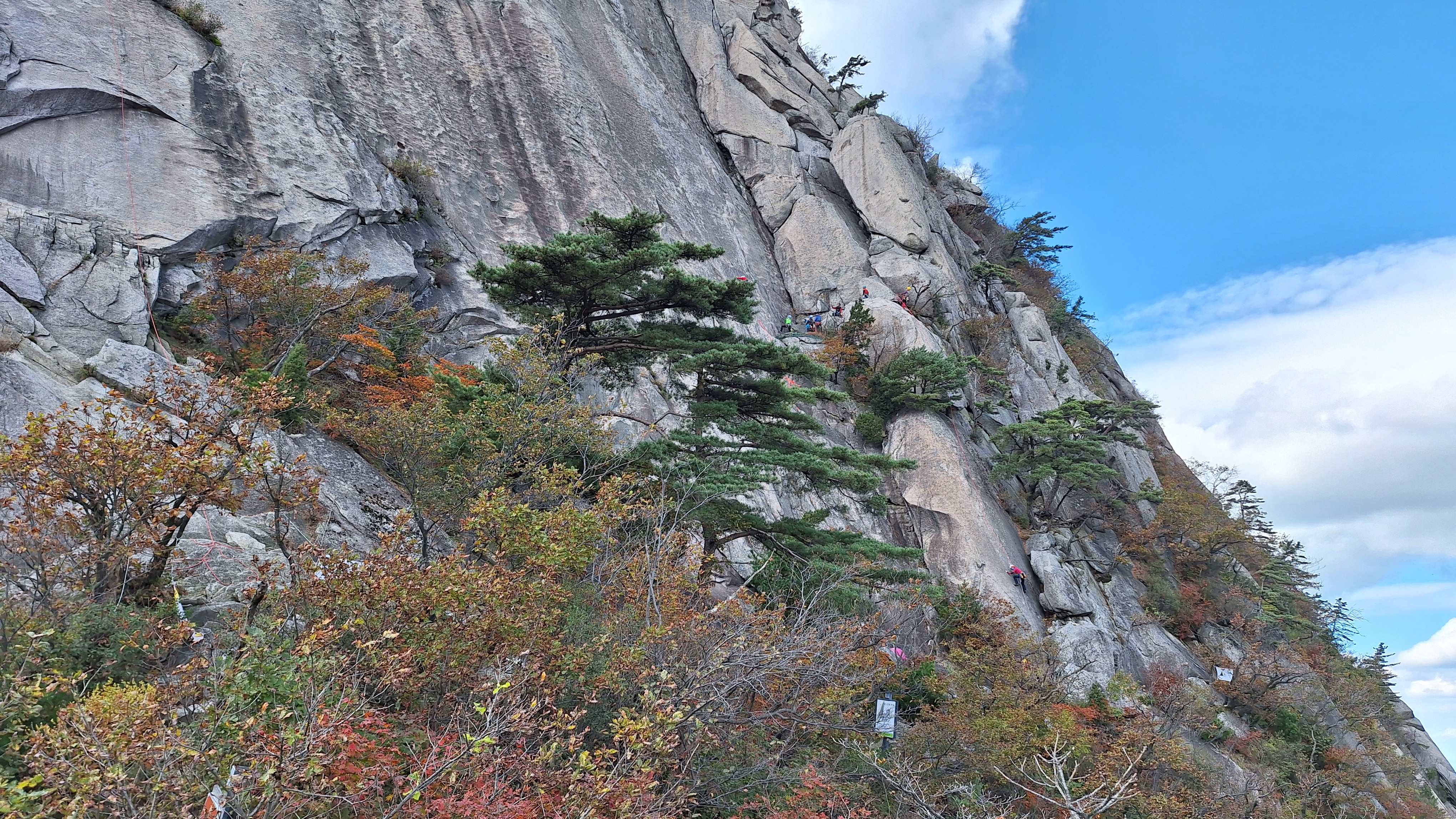 인수봉 일대는 일주일 전에 비해 추색이 완연해 보였다. 아침 기온도 한 자릿수로 떨어져 제법 쌀쌀했다. 지난 주 토요일에 농양 제거 수술을 받은 몸이지만 무리하지 않는 등반은 괜찮을 듯하여 수요등반에 참여하기로 했다. 약속시간을 08시 정각에서 30분 늦춘다는 기범씨의 어젯밤 공지를 내가 놓치는 바람에 도선사광장주차장에 일찍 도착하게 되었다. 몸상태가 정상이 아니기 때문에 일행보다 먼저 천천히 올라갈 수 있게 되어 오히려 잘 된 것이라 여겼다. 천천히 여유로운 발걸음으로 막 물들기 시작한 단풍도 구경하면서 어프로치 하는 기분이 상쾌했다. 양지바른 '취나드B' 루트 앞에서 쌍화차 한 잔을 마신 후에 장비를 착용하는 여유도 부려볼 수 있었다.