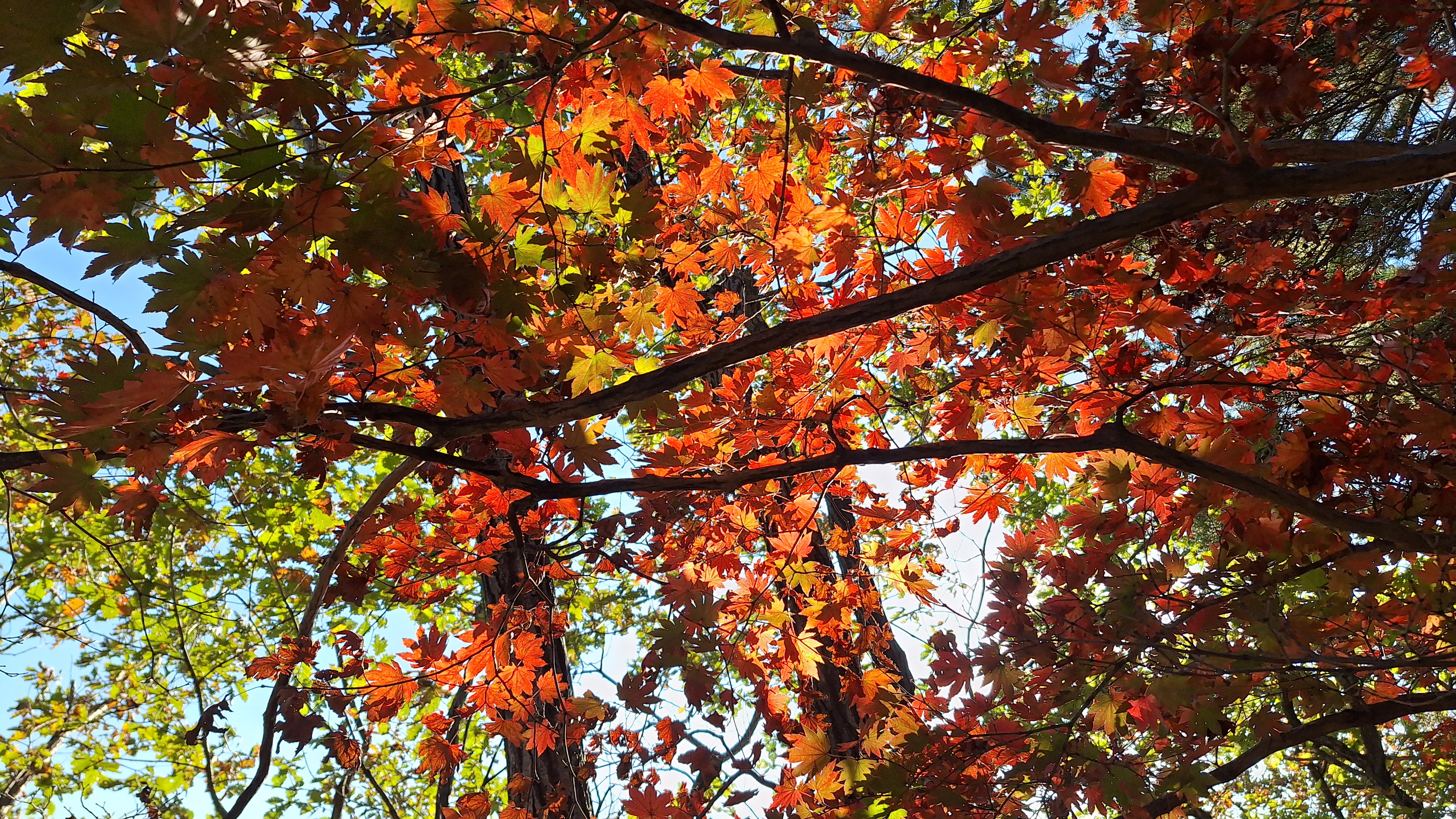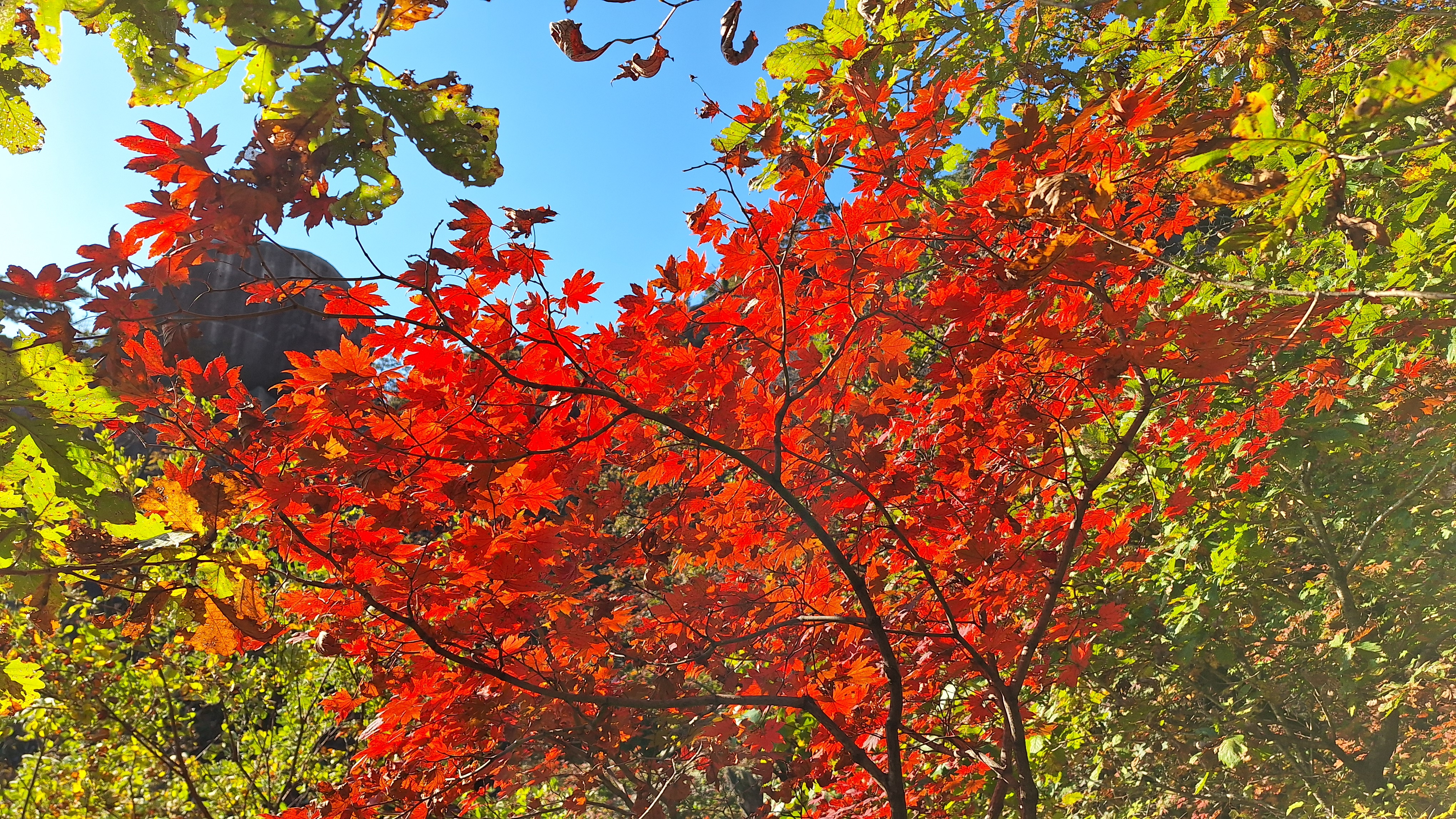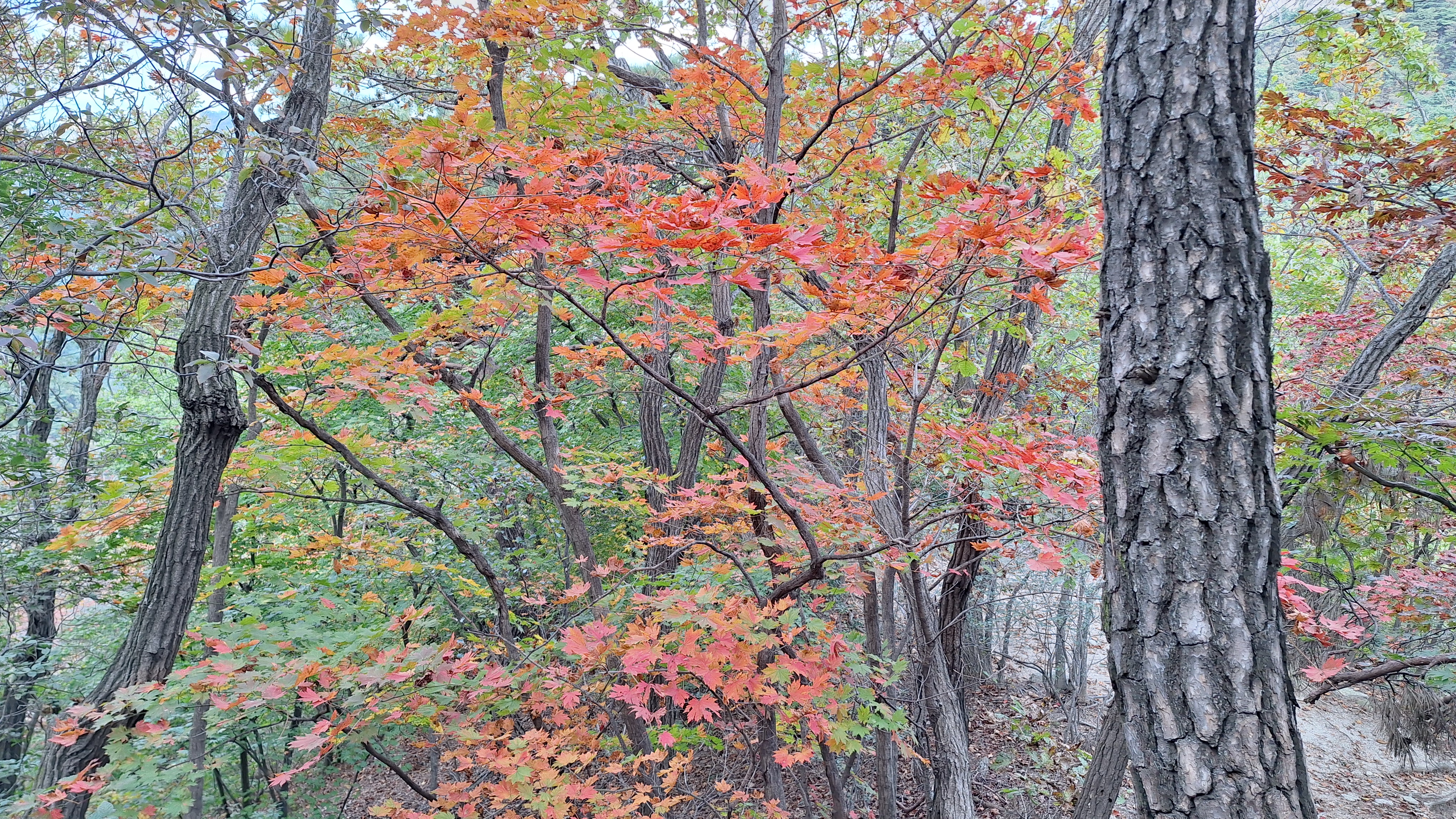 인수봉 일대는 일주일 전에 비해 추색이 완연해 보였다. 아침 기온도 한 자릿수로 떨어져 제법 쌀쌀했다. 지난 주 토요일에 농양 제거 수술을 받은 몸이지만 무리하지 않는 등반은 괜찮을 듯하여 수요등반에 참여하기로 했다. 약속시간을 08시 정각에서 30분 늦춘다는 기범씨의 어젯밤 공지를 내가 놓치는 바람에 도선사광장주차장에 일찍 도착하게 되었다. 몸상태가 정상이 아니기 때문에 일행보다 먼저 천천히 올라갈 수 있게 되어 오히려 잘 된 것이라 여겼다. 천천히 여유로운 발걸음으로 막 물들기 시작한 단풍도 구경하면서 어프로치 하는 기분이 상쾌했다. 양지바른 '취나드B' 루트 앞에서 쌍화차 한 잔을 마신 후에 장비를 착용하는 여유도 부려볼 수 있었다.