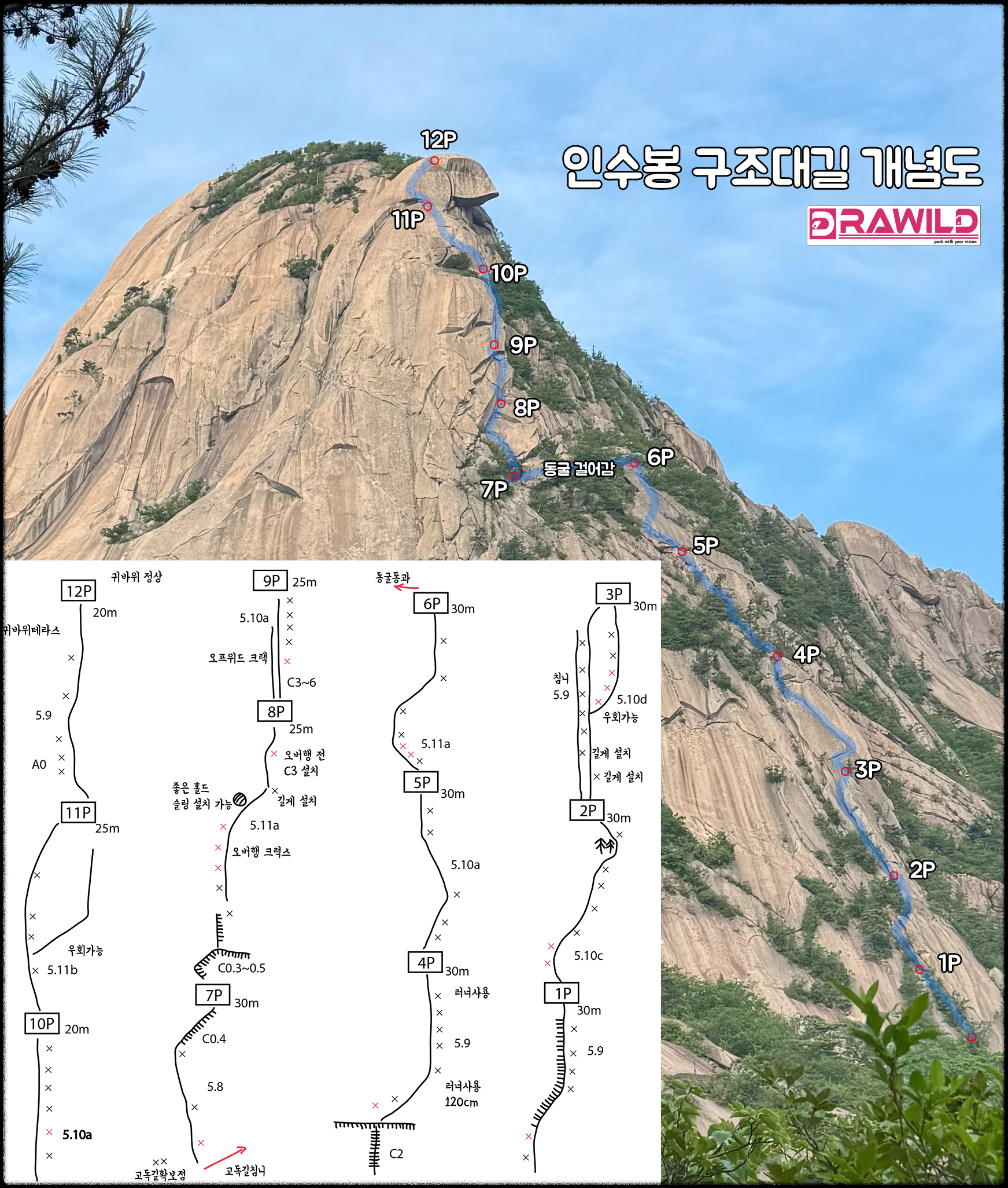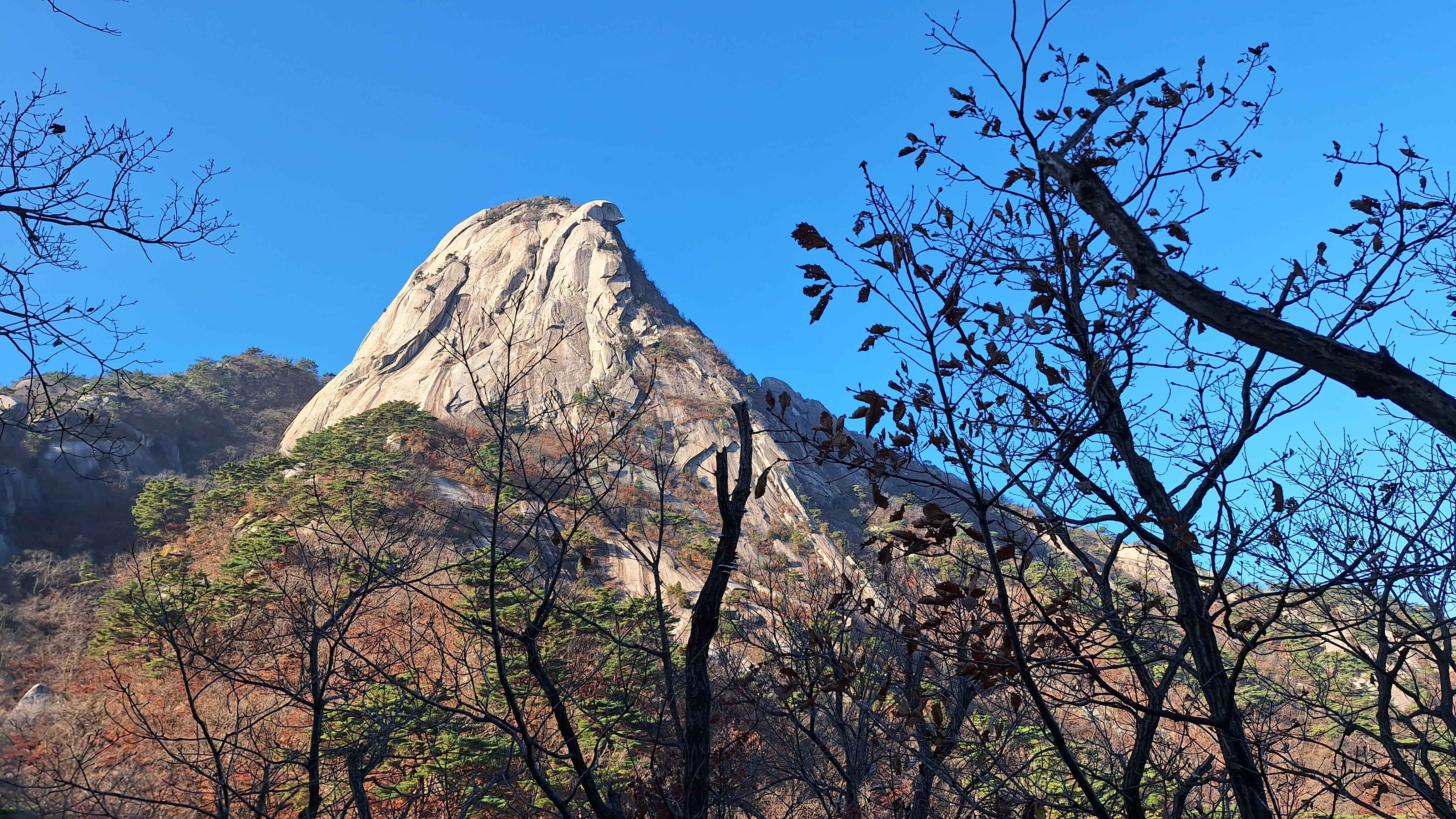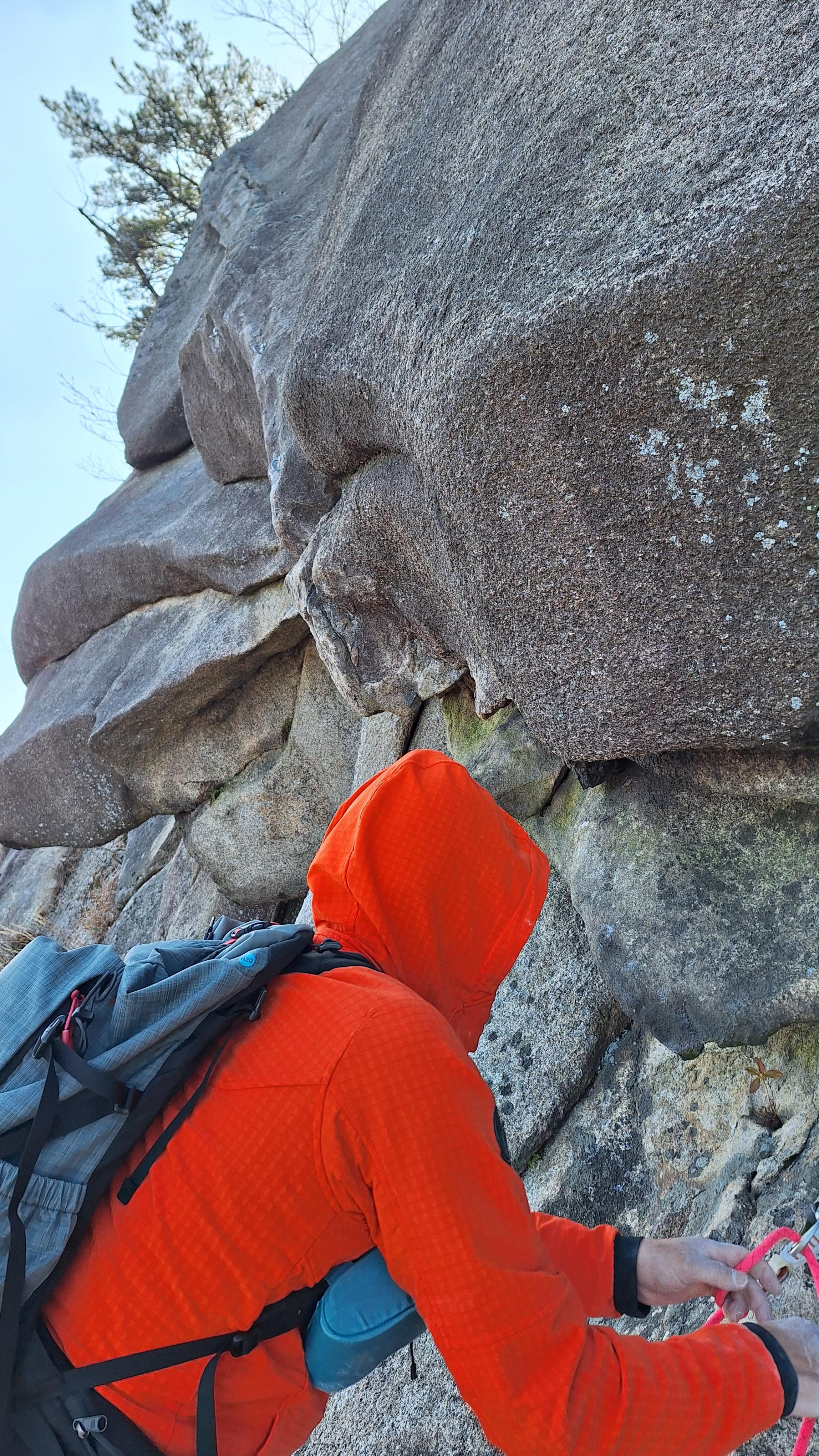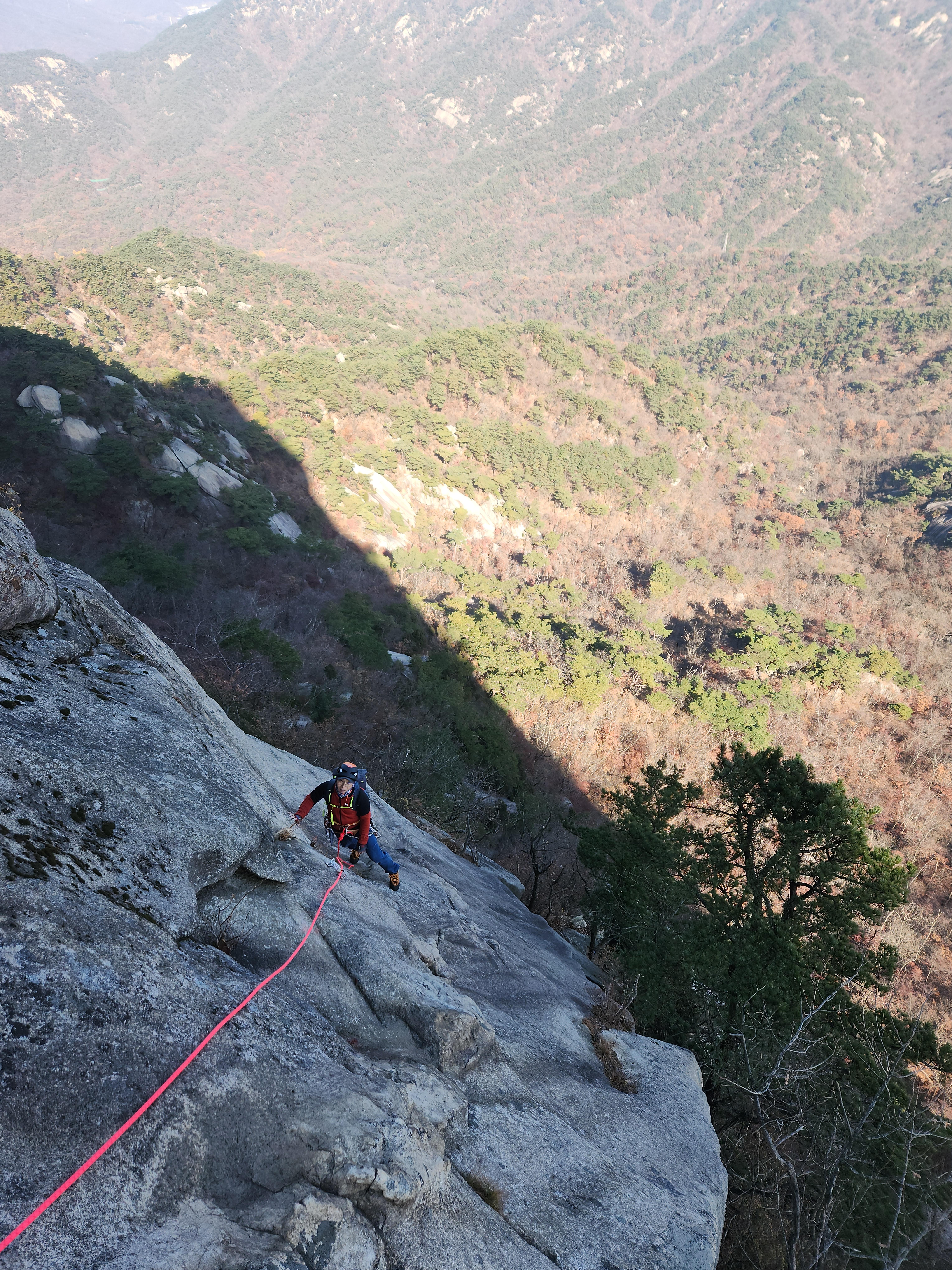 인수봉 북면 하단의 암벽 밑동부터 귀바위 꼭대기까지 총 12피치로 이어지는 '구조대길'은 등반 거리가 인수봉에서 가장 긴 바윗길일 것이다. 나는 암벽등반 초보 시절인 2010년도에 산악회 선배님들을 따라서 딱 한 번 이 구조대길을 올라본 기억이 희미하게 남아 있다. 당시엔 구조대길이 개척된 직후라서 우리팀 리더가 바윗길 초입을 쉽사리 찾지 못하고 헤맨 까닭에 일몰 시간에 쫒기어 루트 중간에서 탈출해야만 했었다. 언젠가는 구조대길을 처음부터 끝까지 완등하면 좋겠다는 마음을 품고 있었는데, 오늘에서야 비로소 그 소원을 풀 수 있게 되었다. 최근에 무릎 상태가 온전치 않은 기범씨가 수요등반 공지를 구조대길로 올렸을 때, 내심 걱정스러웠으나 무사히 완등할 수 있어서 감사한 마음이었다. 바빠진 수술 스케쥴로 인해 구선생님이 함께 등반하지 못한 점이 못내 아쉬웠다.