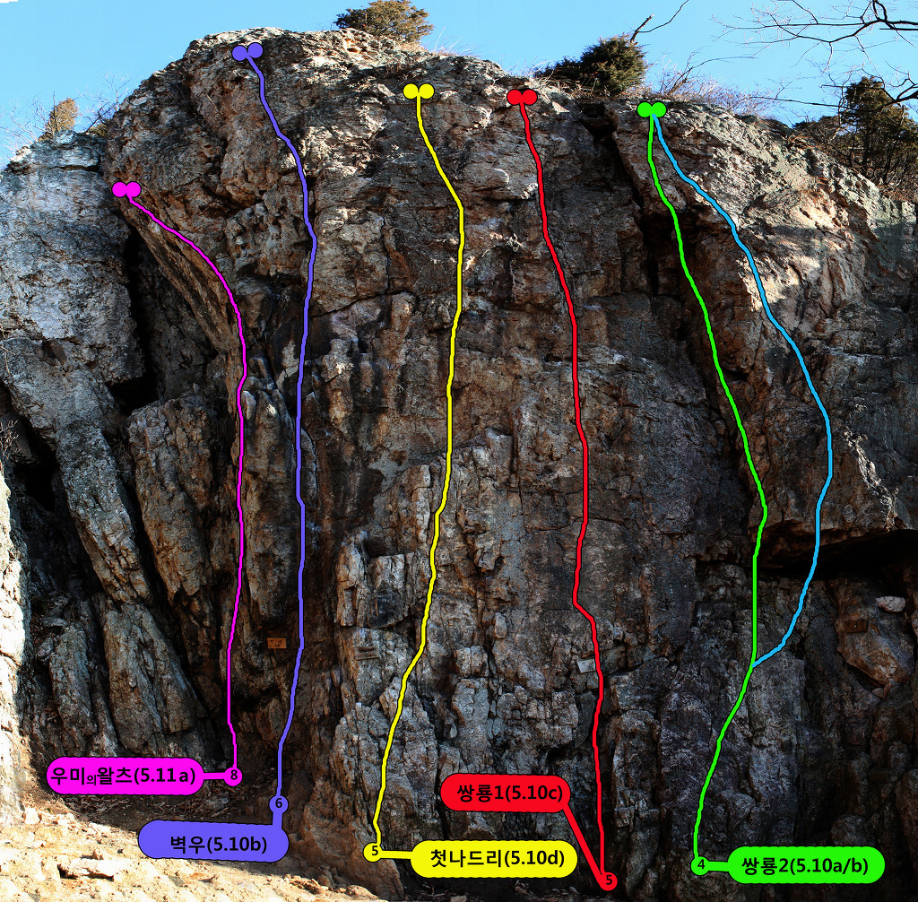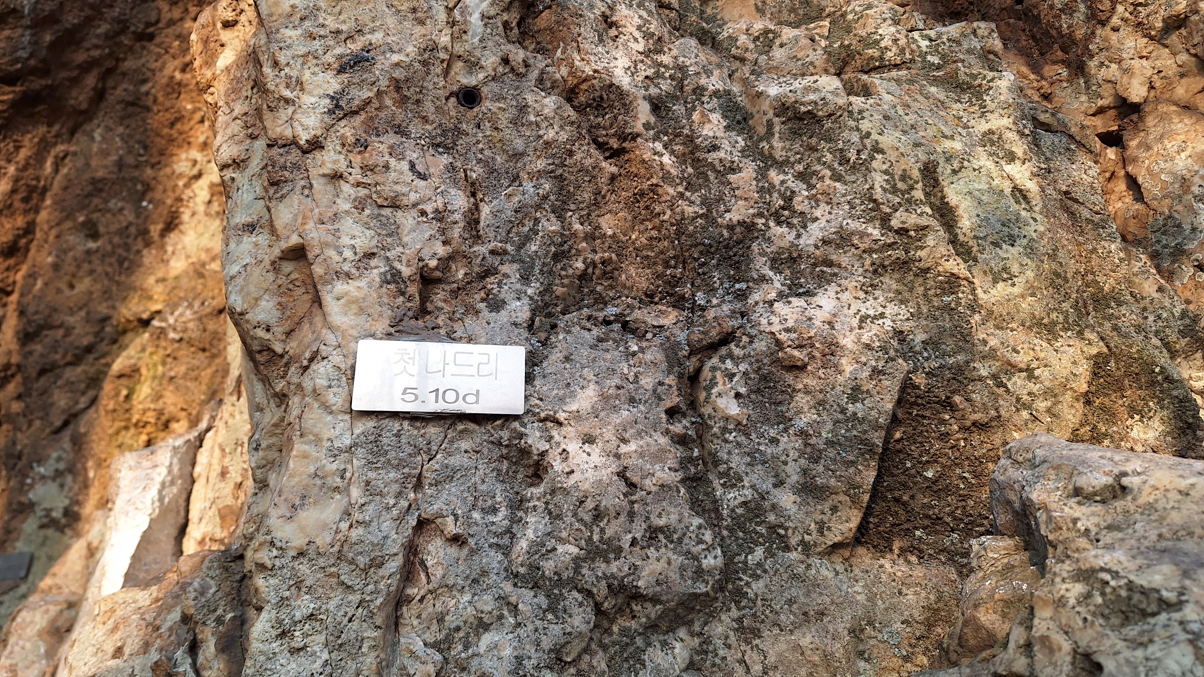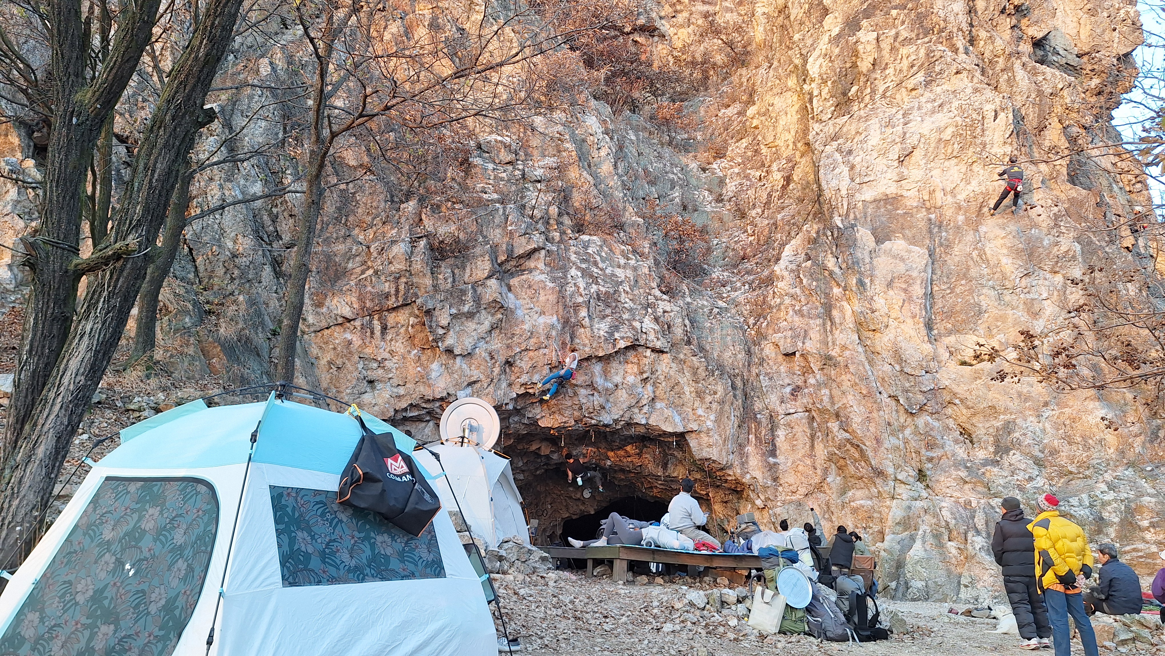 봄날처럼 화창하고 포근한 날씨 속에서 등반을 즐기려는 이들로 조비산 암장은 이른 시간부터 붐볐다. 당연히 예상했던 일이지만 자연암벽에서의 북적대는 분위기는 익숙해지기가 쉽지 않다. 따스한 우측 안쪽 벽의 쉬운 루트들에 먼저 매달린다. 역시나 오버행 구간에서는 지구력이 많이 부족해진 걸 실감한다. 그래도 5개 루트는 채우고 점심을 먹자는 마음가짐으로 몸풀이 등반을 이어간다. 점심 후엔 동굴 우벽에서 두 루트를 등반한 후, 모처럼 아무도 없는 좌벽으로 이동했다. '쌍용1(5.10c)' 루트의 난이도를 5.10a로 잘못 알고 올랐다가 두세 차례의 행도깅 끝에 가까스로 줄을 걸 수 있었다. 톱로핑 방식으로 다시 올라보니 역시나 5.10c 난이도가 맞는 듯했다. 내친김에 바로 왼쪽의 '첫나들이(5.10d)' 루트도 톱로핑 방식으로 올라보았다. 어려운 루트에 도전하는 게 썩 내키지는 않았으나, 엉겹결에 두 루트에 매달리고 보니 그런대로 보람찬 등반을 즐겼다는 만족감이 차올랐다.