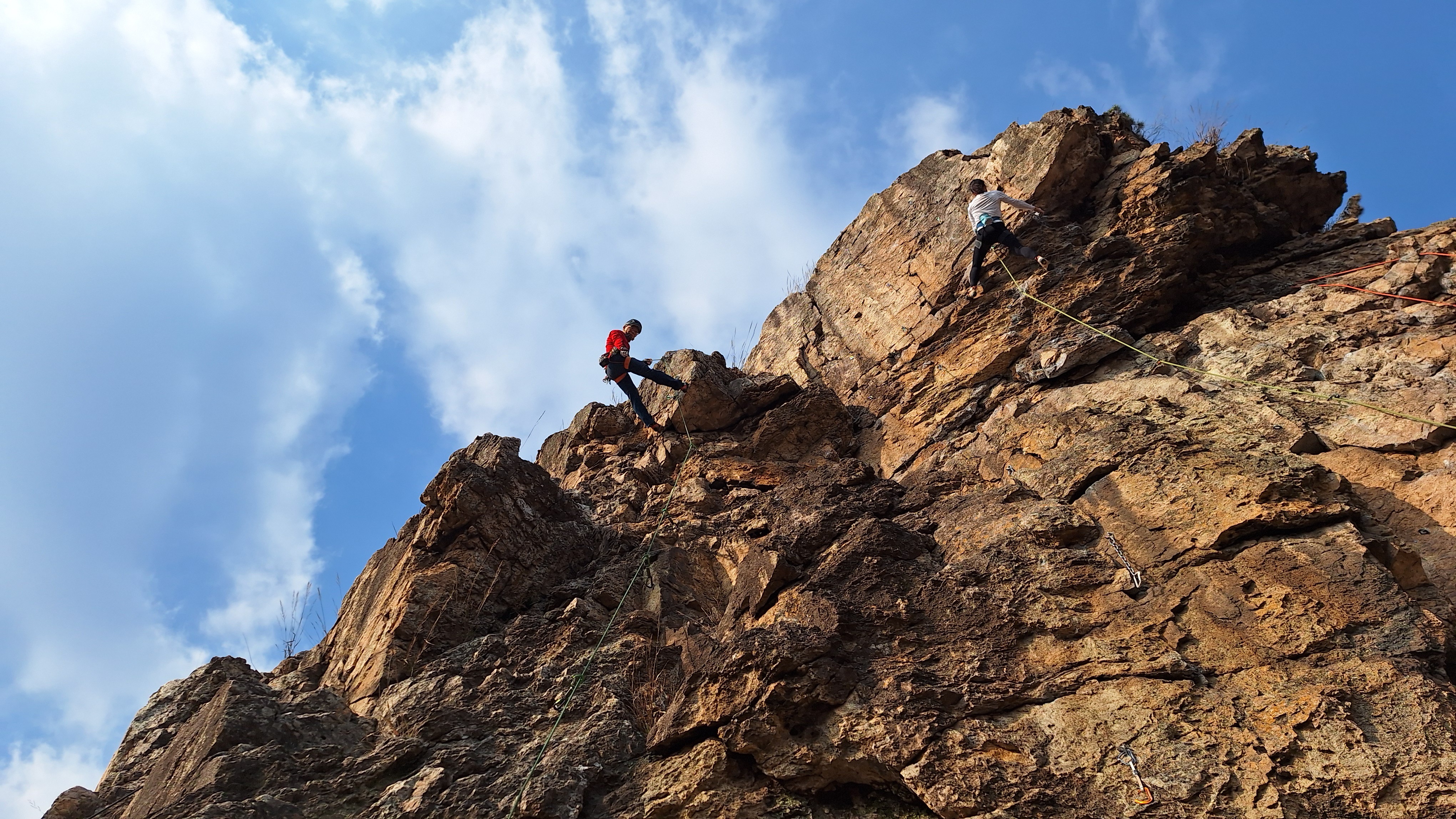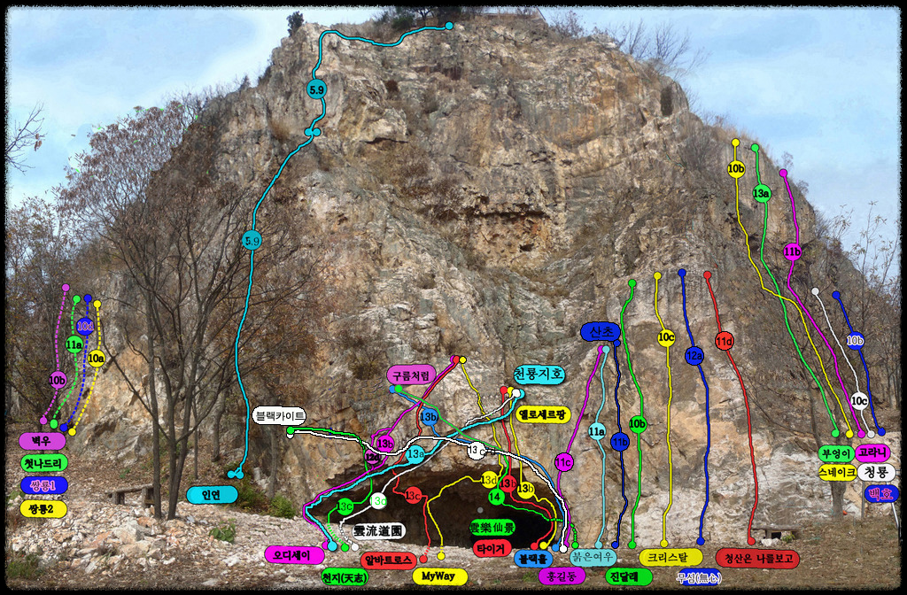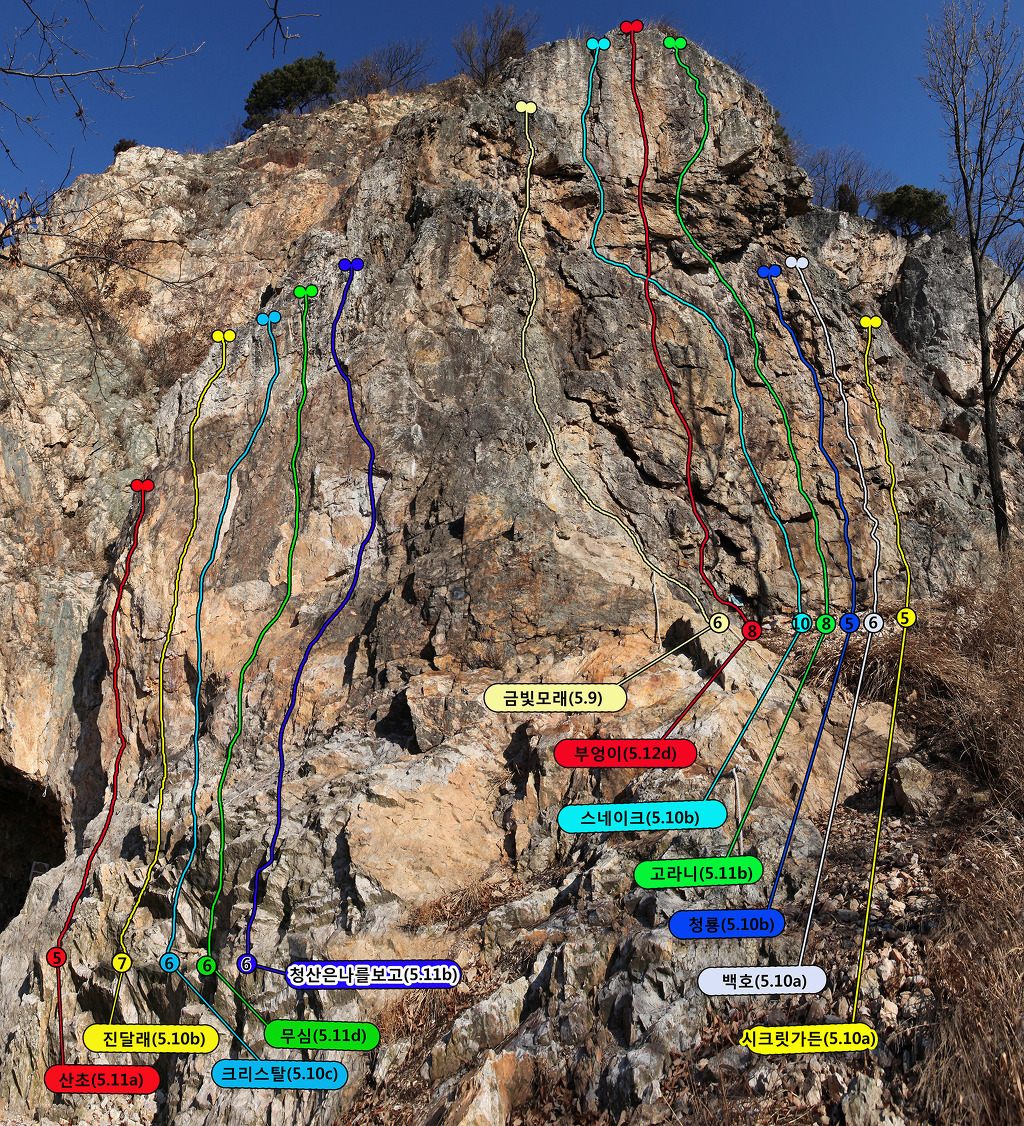 봄날처럼 화창하고 포근한 날씨 속에서 등반을 즐기려는 이들로 조비산 암장은 이른 시간부터 붐볐다. 당연히 예상했던 일이지만 자연암벽에서의 북적대는 분위기는 익숙해지기가 쉽지 않다. 따스한 우측 안쪽 벽의 쉬운 루트들에 먼저 매달린다. 역시나 오버행 구간에서는 지구력이 많이 부족해진 걸 실감한다. 그래도 5개 루트는 채우고 점심을 먹자는 마음가짐으로 몸풀이 등반을 이어간다. 점심 후엔 동굴 우벽에서 두 루트를 등반한 후, 모처럼 아무도 없는 좌벽으로 이동했다. '쌍용1(5.10c)' 루트의 난이도를 5.10a로 잘못 알고 올랐다가 두세 차례의 행도깅 끝에 가까스로 줄을 걸 수 있었다. 톱로핑 방식으로 다시 올라보니 역시나 5.10c 난이도가 맞는 듯했다. 내친김에 바로 왼쪽의 '첫나들이(5.10d)' 루트도 톱로핑 방식으로 올라보았다. 어려운 루트에 도전하는 게 썩 내키지는 않았으나, 엉겹결에 두 루트에 매달리고 보니 그런대로 보람찬 등반을 즐겼다는 만족감이 차올랐다.