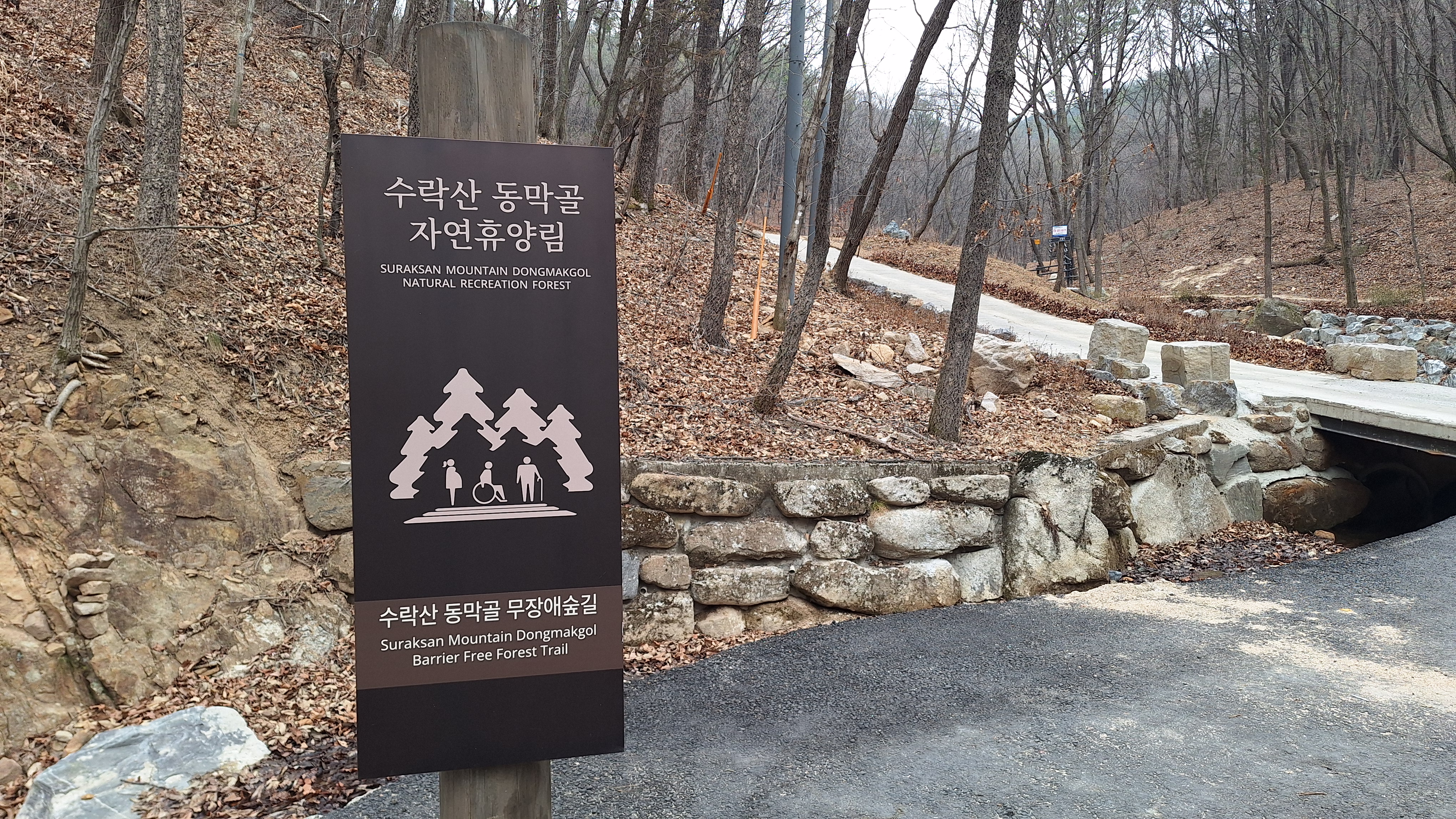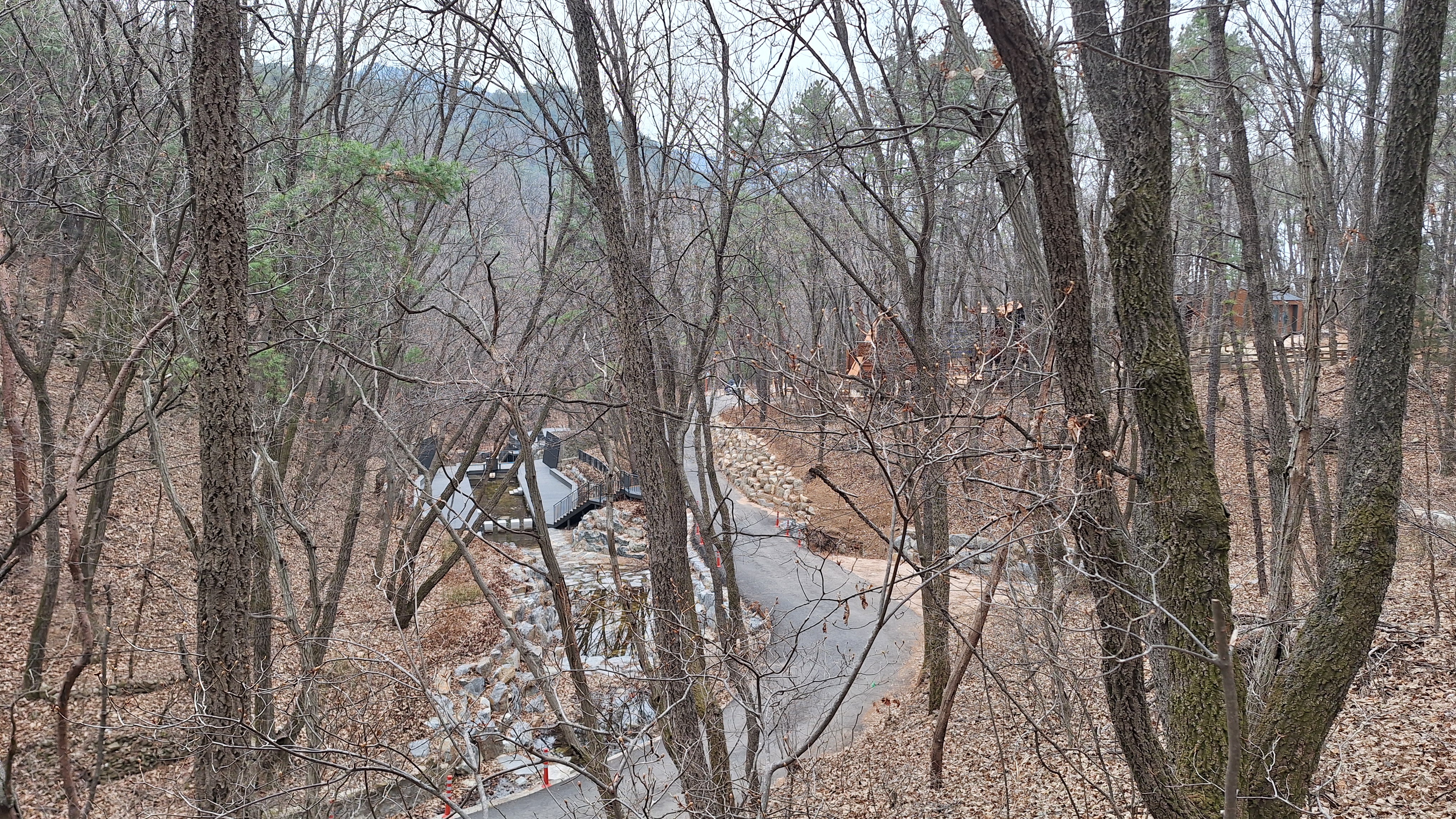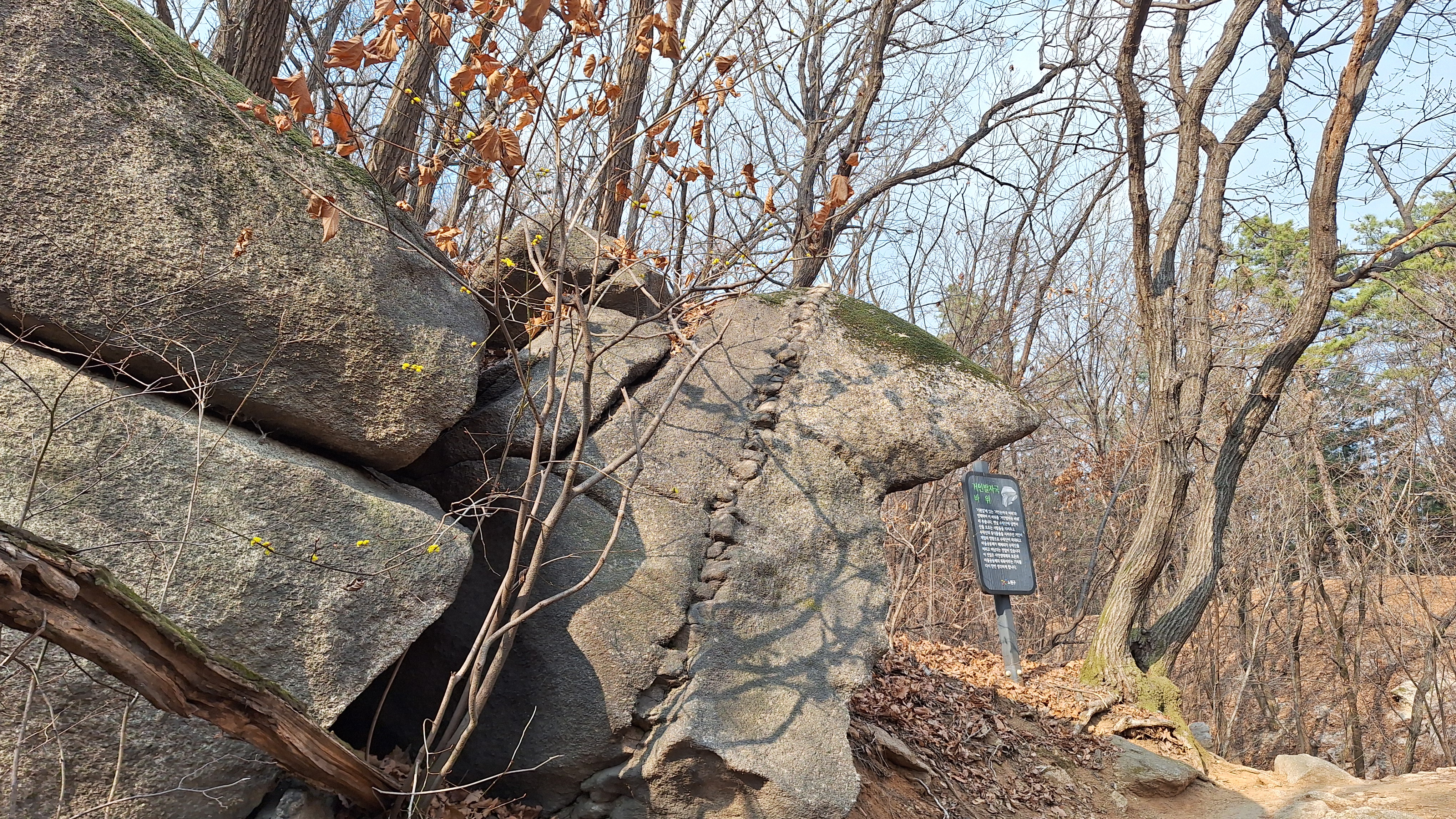 시산제를 하려는 산악회원들로 인해 시장통을 방불케 했던 불암산역을 빠져나와 최근에 매스컴을 통해 접한 동막골 자연휴양림을 구경하면서 무장애숲길을 통과했다. 새롭게 조성된 휴양림의 정갈한 숙소들과 놀이시설을 둘러보는 재미가 있었다. 오솔길로 접어들자 노오란 생강나무꽃을 만날 수 있었다. 올해 산에서는 처음 보는 봄꽃인 셈이다. 덕릉고개에서 올라오는 능선길과 합류하여 도솔봉을 지나 주능선길에 들어서니 산객들이 많아지기 시작했다. 호젓하게 걷고 싶은 마음에 새광장을 거쳐 벽운계곡으로 하산했다. 계곡 옆의 데크에서 잠시 휴식시간을 가진 후 오후의 햇볕이 좋아서 조금 더 걸어보기로 했다.