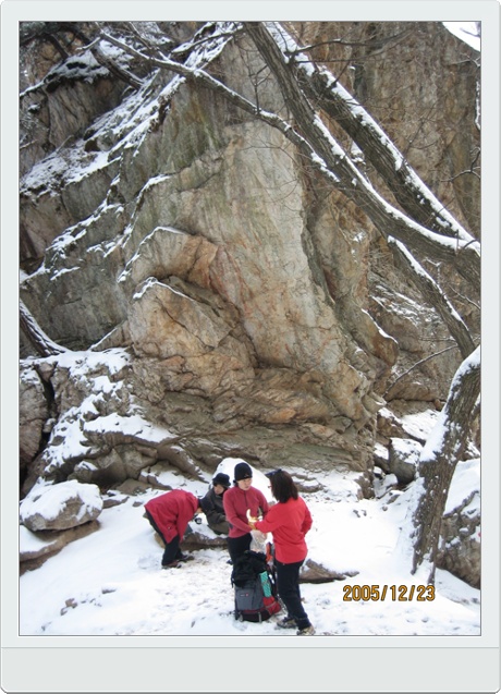 목요일 밤에 노아님의 제안으로 이루어진 번개 산행이다. 그간 시어머님의 입원으로 노아님의 활발한 몸과 마음이 답답하셨을 것이다. 이웃지간인 노아님과 써니님이 동지 팥죽을 나눠 먹다 번개 산행에 의기투합하셨단다. 지난 12월 4일, 나의 삼악산 산행 사진을 접한 후 그곳을 꼭 가보고 싶었다고 하신다. 방학으로 시간 여유가 생긴 내가 같이 하기로 함으로써 써니님과 노아님, 가우스 셋이서 단촐하게 삼악산 등반에 나섰다. 밤 사이 내린 눈이 제법 쌓여 산하는 깨끗하게 포장되어 여행의 즐거움을 더했다.
