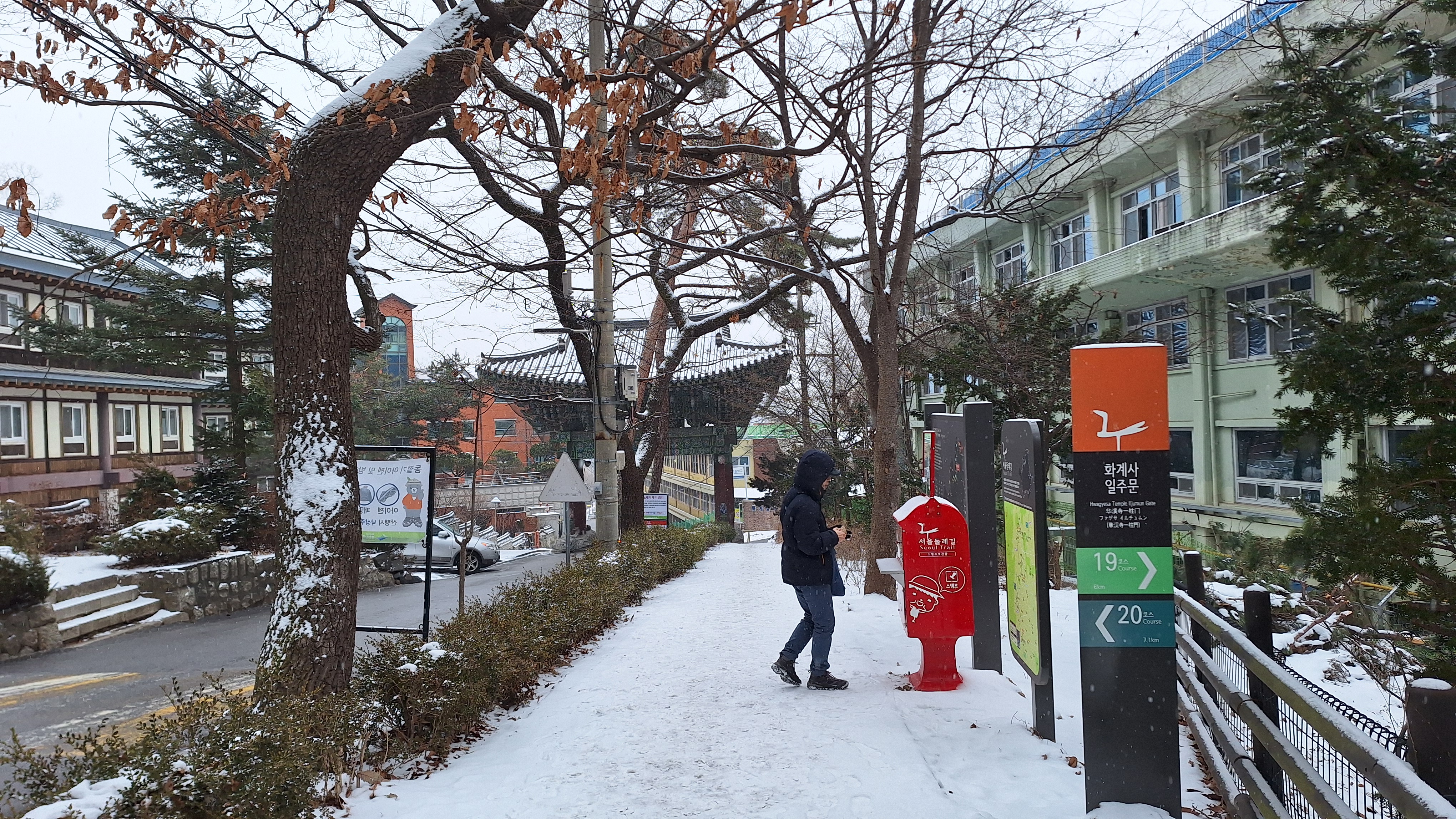 설연휴 마지막 날인 어제 어머니께서 KTX로 귀향하셨다. 우리집에서 어머니와 함께 보내는 동안 아내는 효도한답시고 삼시 세끼를 꼬박꼬박 잘 챙겨드렸다. 그 덕분에 나도 맛난 명절 음식들로 평소보다 두 배가 넘는 칼로리를 섭취한 탓에 체중은 순식간에 2kg 가까이 불어났다. 오늘부터는 다시 건강을 생각하는 식생활과 운동 패턴으로 돌아와야 한다. 아침부터 눈발이 날리는데도 불구하고 아내와 함께 집 뒤로 이어지는 서울둘레길을 걷기로 한다. 북한산둘레길과 겹치는 서울둘레길 19코스는 아마도 우리 부부가 가장 많이 산책하던 길일 것이다. 오늘은 솔샘역에서 접근하는 경로를 따라 일주일 전에 걸었던 성북구의 명상길과 강북구로 넘어오는 솔샘길에서 이어지는 흰구름길 구간을 걷기로 한다. 구름전망대에서 컵라면을 먹을 때만 하더라도 간간히 흩날리던 싸라기눈은 오후 들어 함박눈으로 변했다. 화계사 일주문 앞에서 스탬프를 찍고 오늘은 여기에서 둘레길을 탈출하기로 결정한다. 주택가로 내려와 EBS 다큐에 나왔던 건축물을 찾아보는 재미도 있었다.